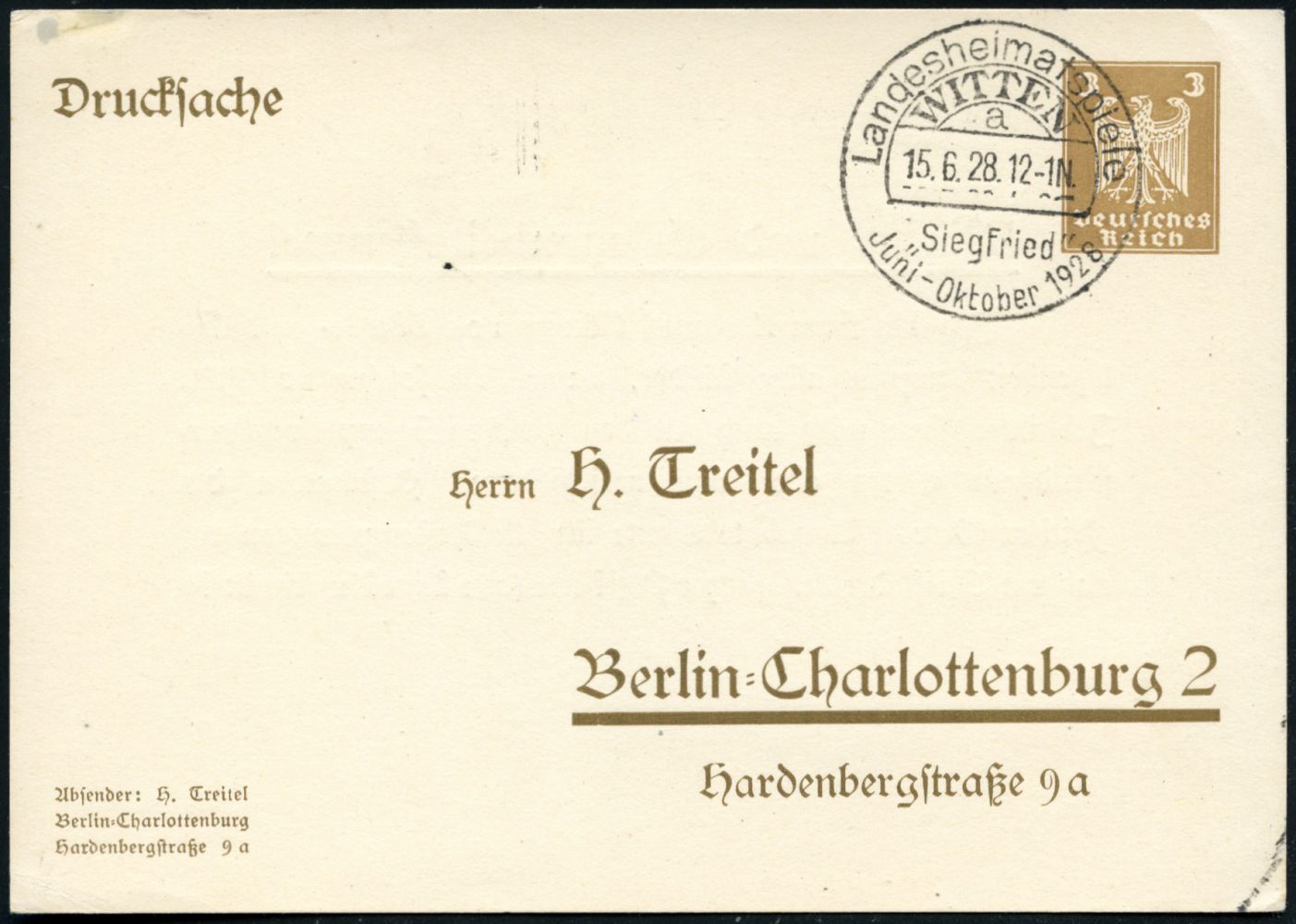 10960 | 25 € | PL-Raum 58 : WITTEN/ a/ Landesheimatspiele/ "Siegfried"/ Juni-Okt. 1928 (15.6.) HWSt klar auf PP 3 Pf. Adler, braun: H. Treitel.. (Mi.PP 77/B 1) klar gest. Inl.-Karte (Bo.5 a) | ![]() | |