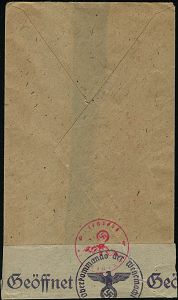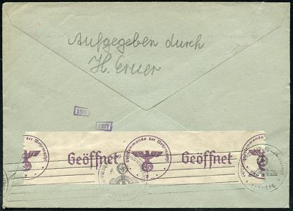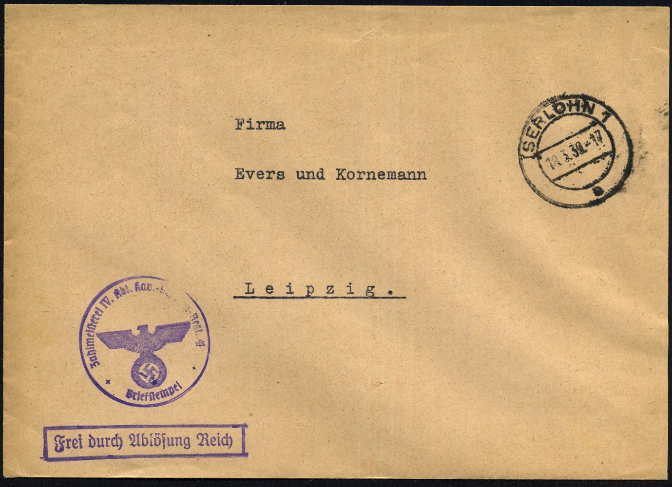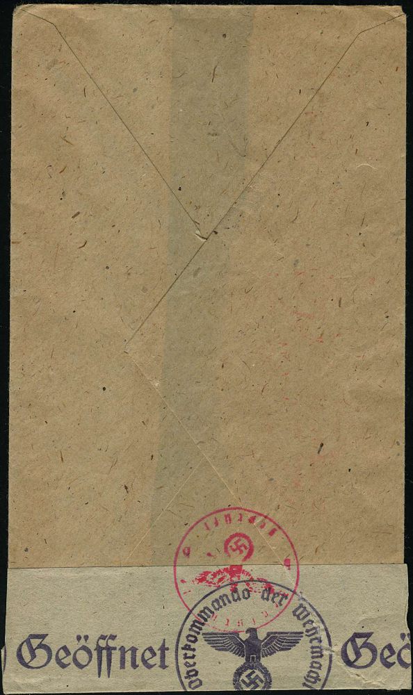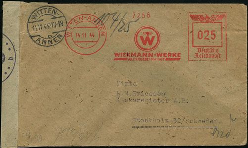 10968 | 35 € | PL-Raum 58 : WITTEN-ANNEN/ W/ WICKMANN-WERKE/ AG 1944 (14.11.) AFS Francotyp "Reichsadler" 025 Pf. (Monogr.-Logo mit Hand mit Blitzen + 1K-Brücke: WITTEN-/b/ANNEN , rs. OKW-Zensurstreifen "b" + roter 1K: Zensurstelle/b geprüft b mit Tilde = Gestapo-Zensur Berlin! (Rie.B-14 b, B-53 c, zus.200 Pkte.), Ausl.-Zensur-Bf. n. Stockholm, vergl. Kat.-Nr. 10970 u.a. (Dü.E-5CGh) | ![]() ![]() | |