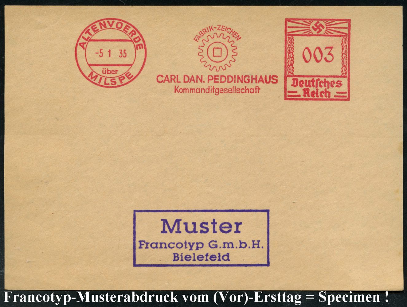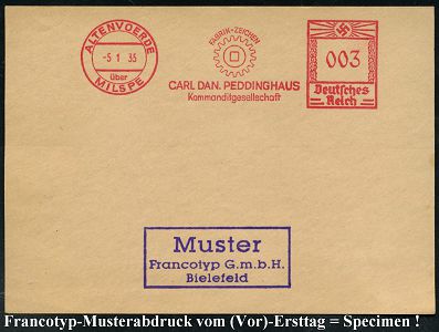 10744 | 35 € | PL-Raum 58 : ALTENVOERDE/ über/ MILSPE/ ..CARL DAN.PEDDINGHAUS.. 1935 (5.1.) AFS-Musterabdruck Francotyp "Hakenkreuz" (Zahnrad-Logo) glasklar gest. Francotyp-Musterblatt vom (Vor)-Ersttag !, selten!, vergl. Kat.-Nr. 10745 (Dü.E-3CEo) | ![]() ![]() | |
