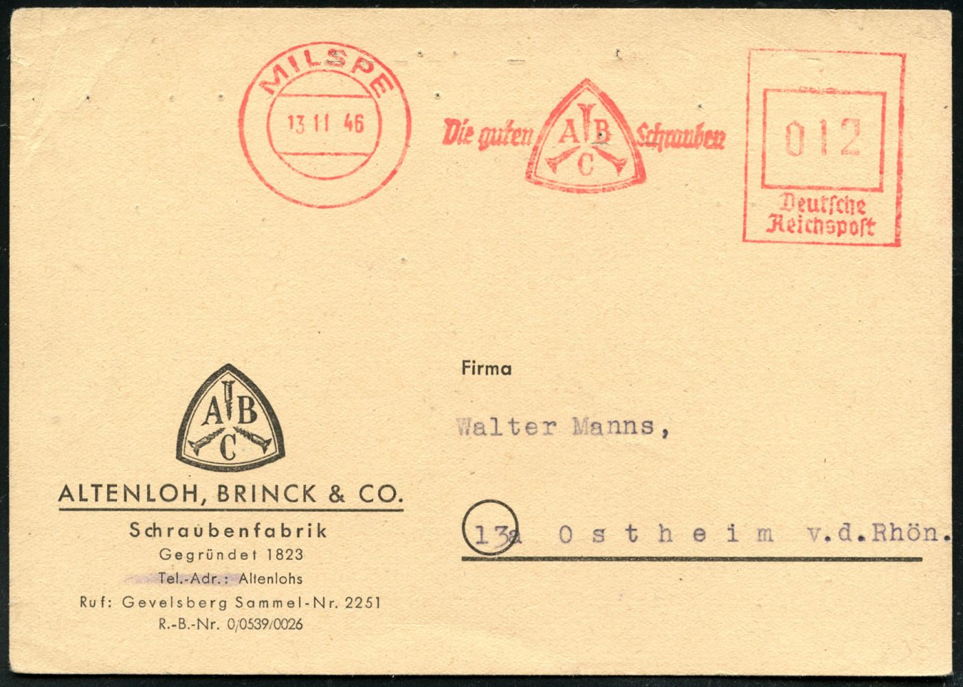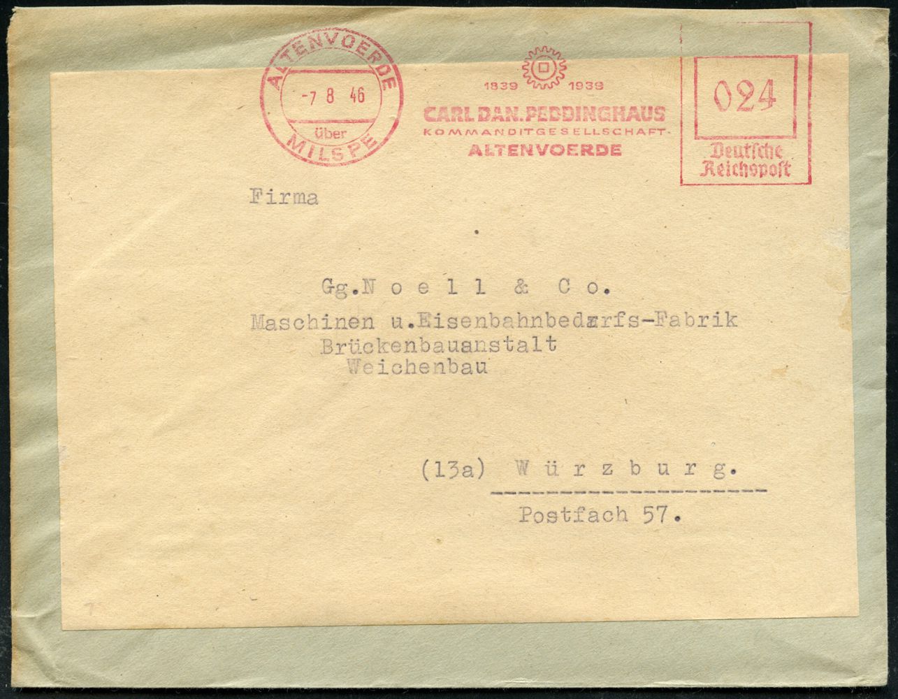10745 | 25 € | PL-Raum 58 : ALTENVOERDE/ über/ MILSPE/ 1839 1939/ CARL DAN.PEDDINGHAUS.. 1946 (7.8.) aptierter Jubil.-AFS Francotyp "Reichsadler" = entfernt = Notmaßnahme! (Zahnrad-Logo) rs. ovaler Abs.-HdN, klar gest. Fern-Bf. (Dü.E-13 J-127o) | ![]() | |