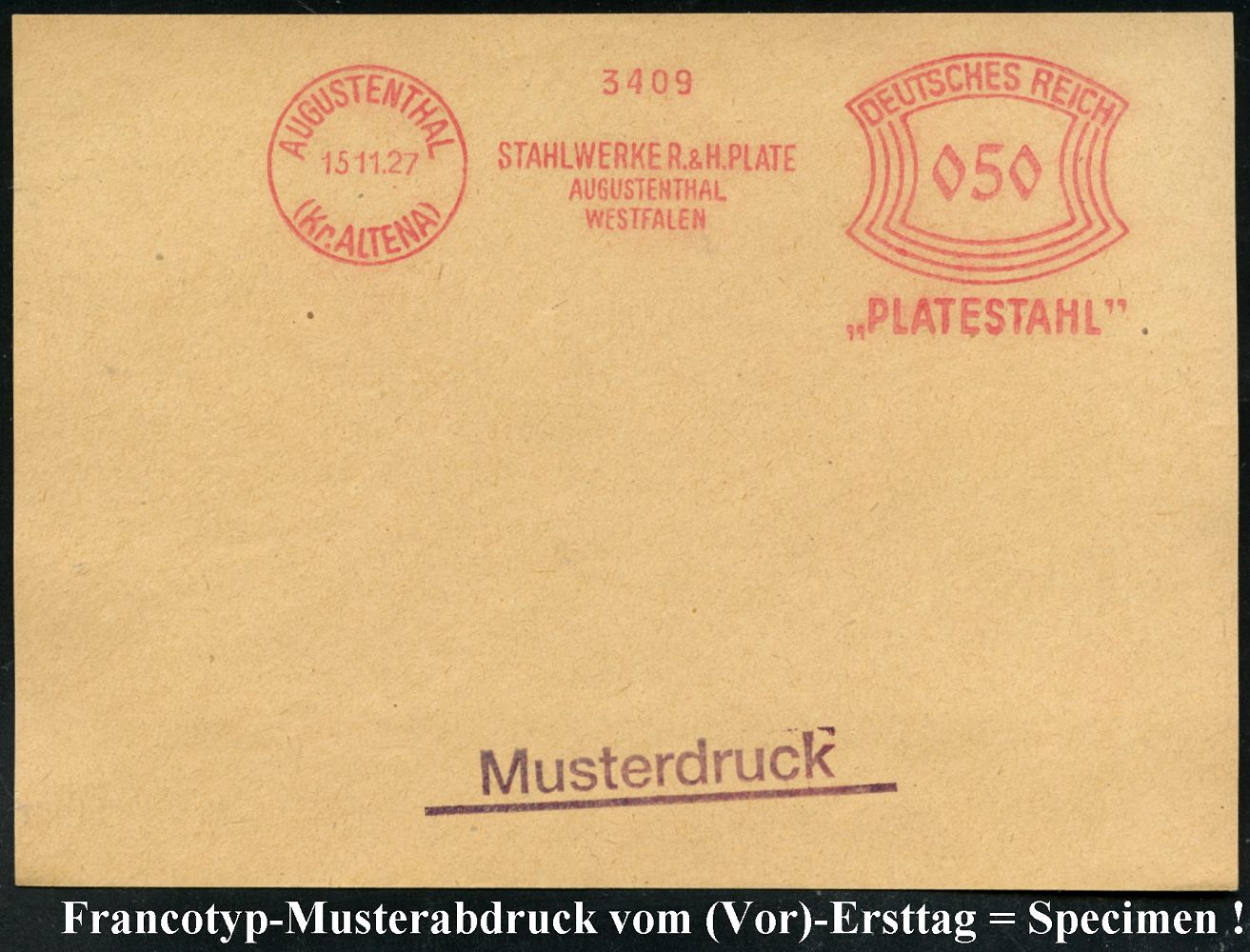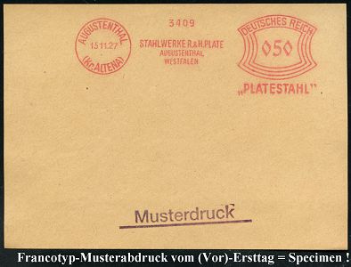 10746 | 35 € | PL-Raum 58 : AUGUSTENTHAL/ (Kr.ALTENA)/ STAHLWERKE &. & H.PLATE.. 1927 (15.11.) AFS-Musterabdruck Francotyp "Bogenrechteck" , glasklar gest. Francotyp-Musterblatt vom (Vor)-Ersttag !, selten!, vergl. Kat.-Nr. 10747 (Dü.E-1BAh) | ![]() ![]() | |