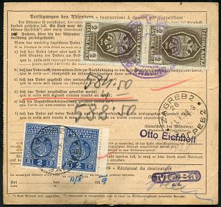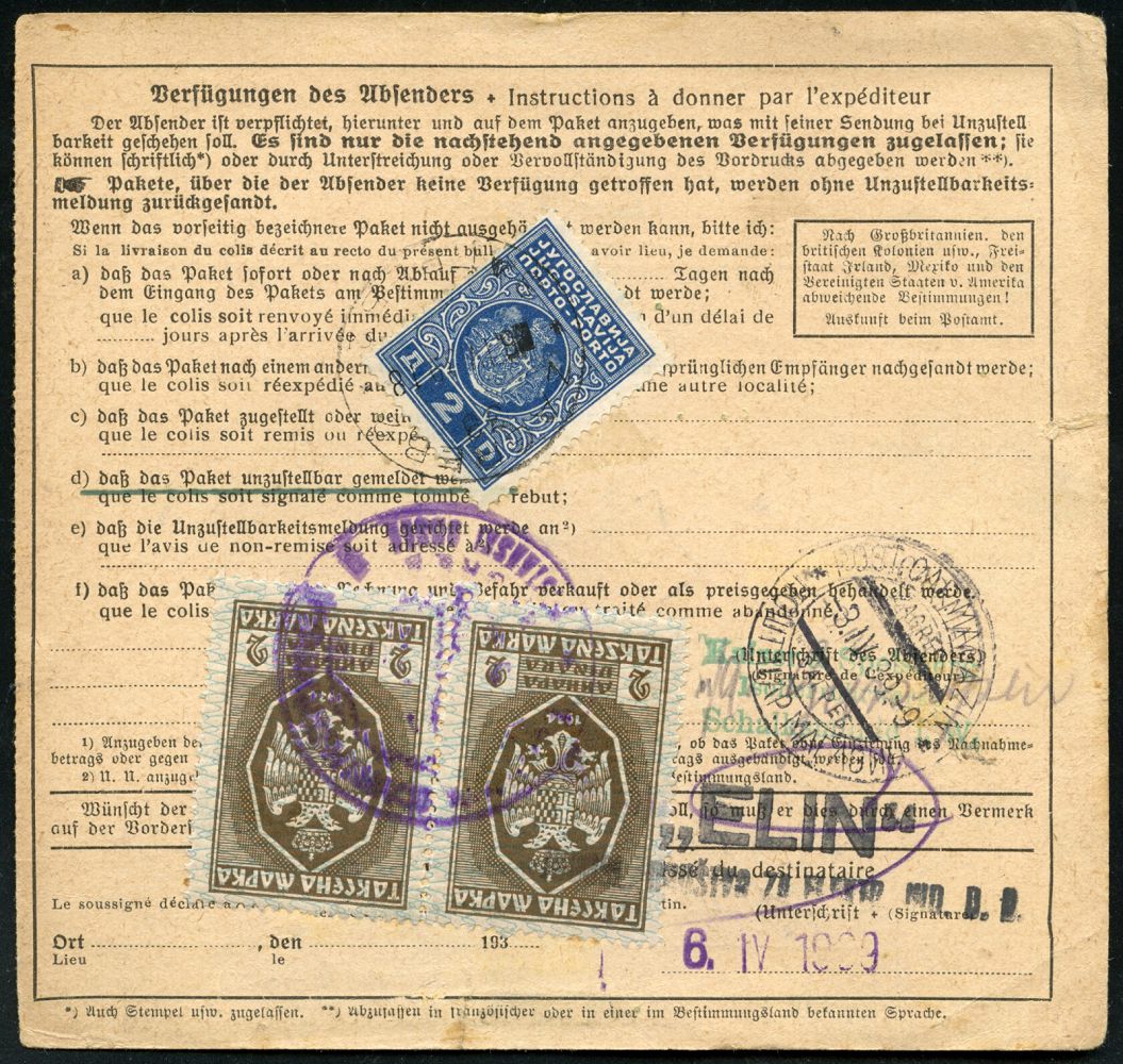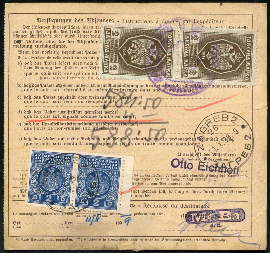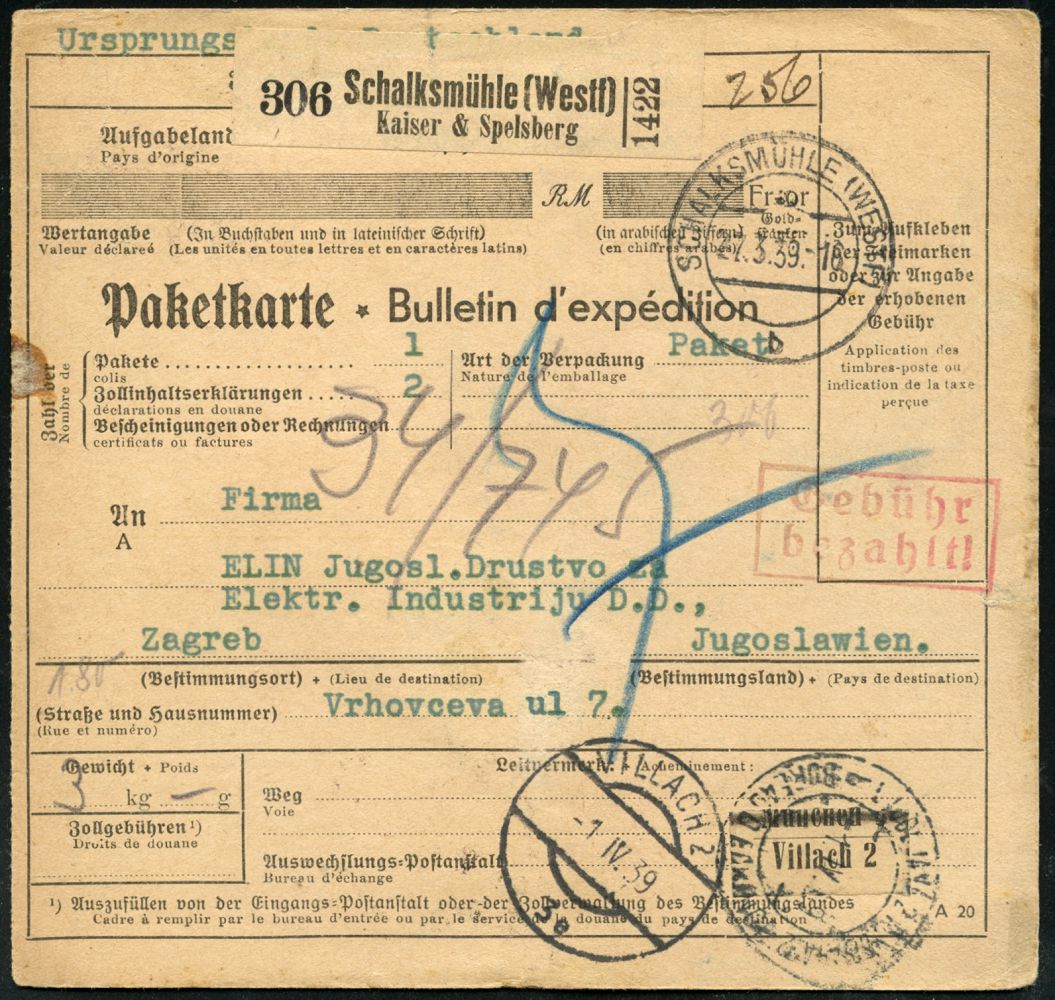 10919 | 25 € | PL-Raum 58 : SCHALKSMÜHLE (WESTF)/ b 1939 (27.3.) 2K-Steg + rotviol. Ra.2: Gebühr/ bezahlt + schw. Selbstbucher-Paketzettel: Schalksmühle (Westf)/ Kaiser & Spelsberg + Leitweg-1K-Brücke: VILLACH 2 etc., klar gest. Ausl.-Selbstbucher-Paketkarte (minim. Rißchen geschl.) n. Zagreb, rs. jugoslaw. Tax- u. Fiskalmarken! | ![]() ![]() | |