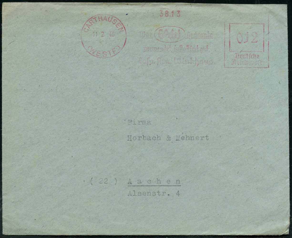 10751 | 22 € | PL-Raum 58 : CARTHAUSEN/ (WESTF.)/ Wer CMW Apparate/ verwendet,installiert gut./ Casp.Arn.Winkhaus 1946 (11.2.) aptierter AFS Francotyp "Reichsadler" = entfernt = Notmaßnahme! (Monogr.-Logo) zeitbedingt etw. schwach, Fern-Bf. (Dü.E-12 J-127h) | ![]() ![]() | |