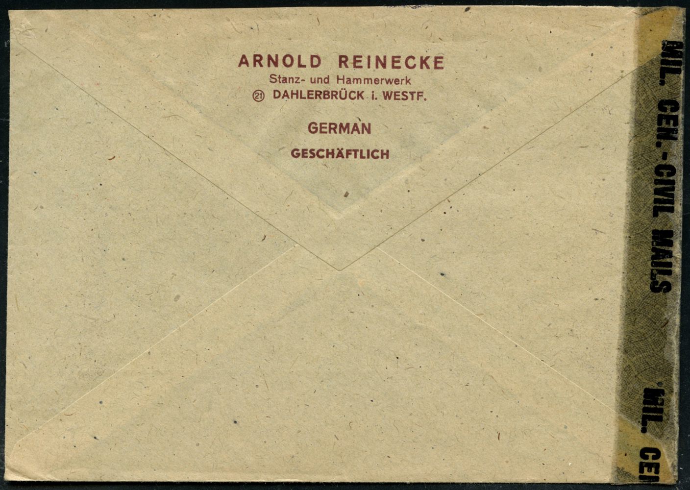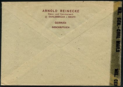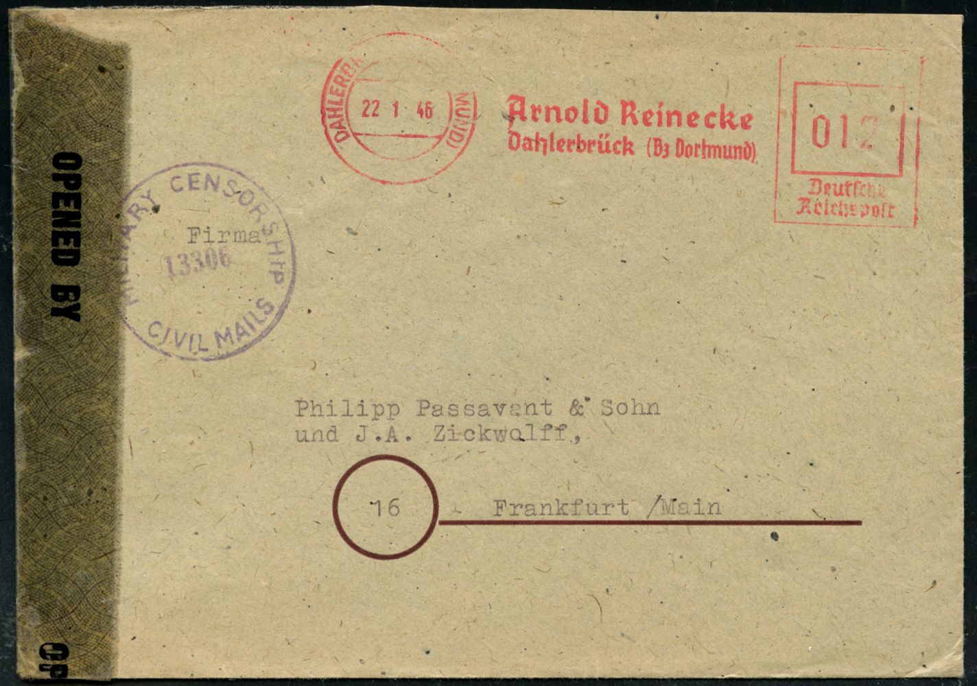 10753 | 22 € | PL-Raum 58 : DAHLERBRÜCK (BZ DORTMUNG)/ Arnold Reinecke.. 1946 (22.1.) aptierter AFS Francotp "Reichsadler" = entfernt = Notmaßnahme! (im Orts oben nicht voll) + viol. US-Zensur-1K: MILITARY CENSORSHIP/13306&CIVIL MAILS + Zensurstreifen: OPENED BY/ MIL. CEN.-CIVIL MAILS (= Offenbach, Rie.A-1b, 102) rs. Abs.-Vordruck: ARNOLD REINECKE, Stanz- u. Hammerwerk, Inl.-Zensur-Bf. n. Ffm. (Dü.E-12 J-129o) | ![]() ![]() | |