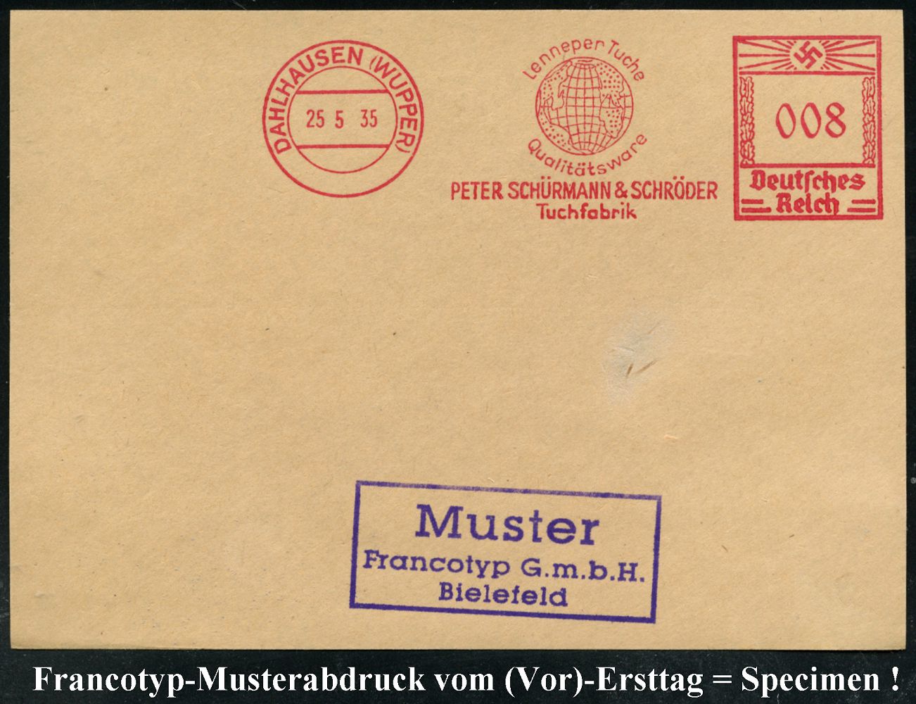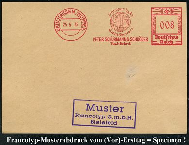 10755 | 35 € | PL-Raum 58 : DAHLHAUSEN (WUPPER)/ Lenneper Tuche/ ..PETER SCHÜRMANN & SCHRÖDER/ Tuchfabrik 1935 (25.5.) AFS-Musterabdruck Francotyp "Hakenkreuz" (Globus-Logo) glasklar gest. Francotyp-Musterblatt vom (Vor)-Ersttag !, selten! (Dü.E-3CEo) | ![]() ![]() | |