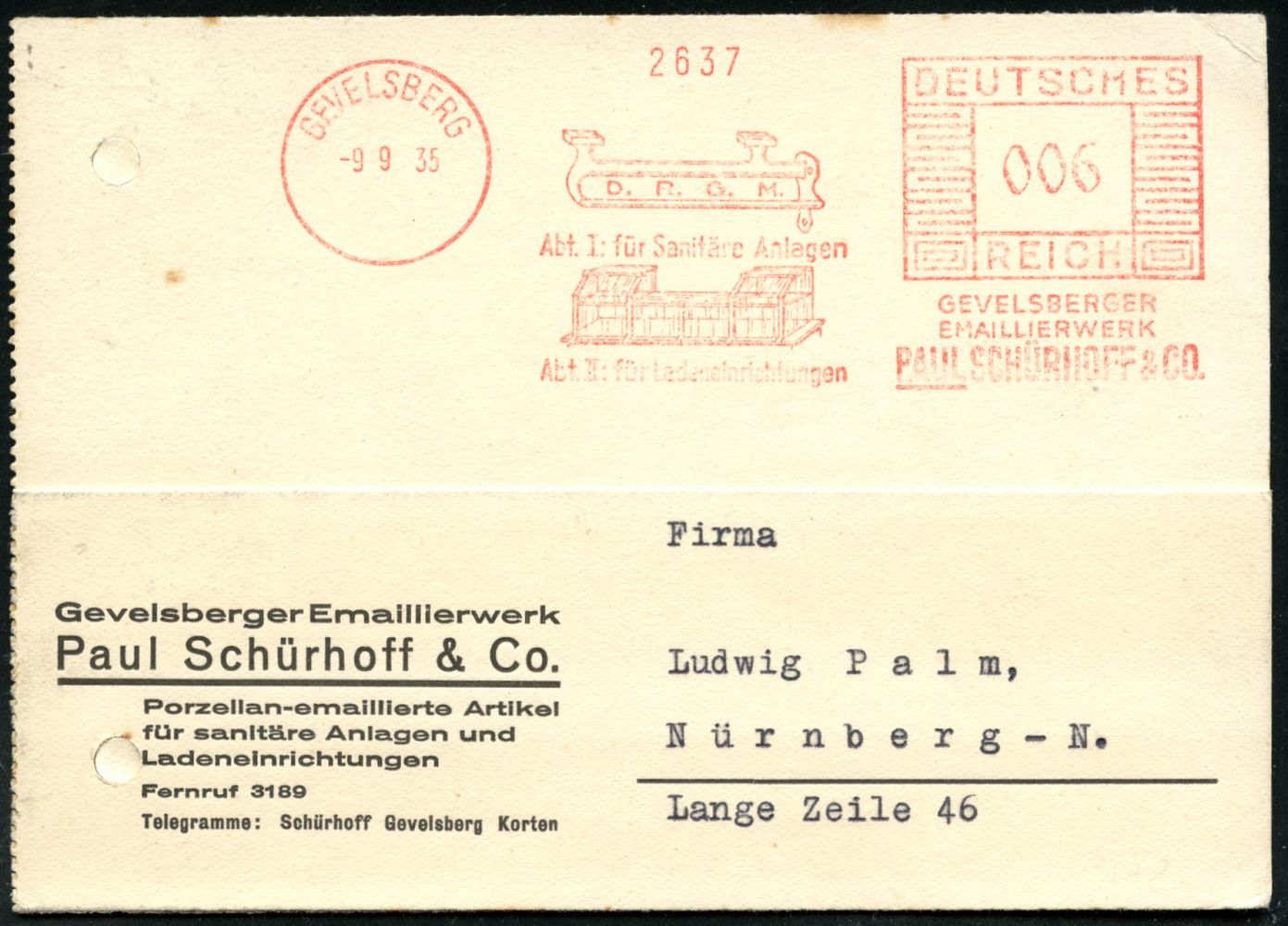 10764 | 18 € | PL-Raum 58 : GEVELSBERG/ D.R.G.M./ Abt.I: für Sanitäre Anlagen/ Abt.II: für Ladeneinrichtungen/ GEVELSBERGER/ EMAILLIERWERK/ PAUL SCHÜRHOFF & CO 1935 (9.9.) AFS Francotyp "Mäanderrechteck" (Motive: Konsole bzw. Glaskästen) Firmen-Kt.: Gevelsberger Emaillierwerk.. (Reg.-Lochung geschl.), Fern-Kt., seltene Motive! (Dü.E2CEh) | ![]() | |