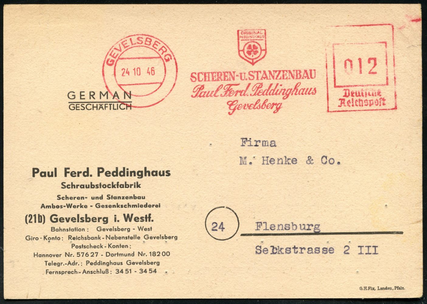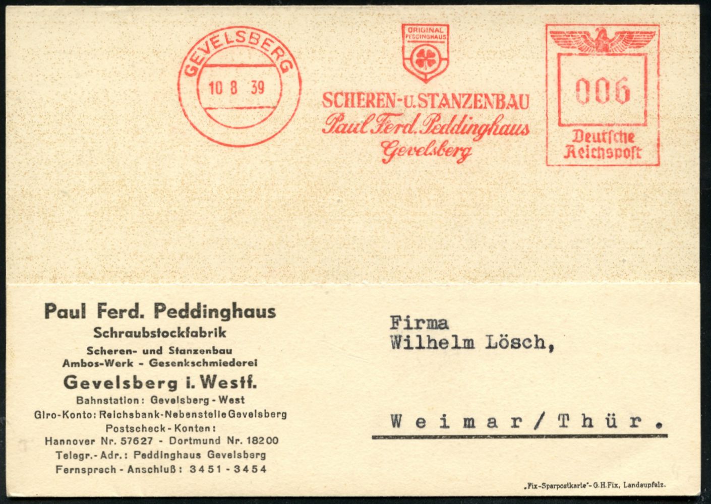 10765 | 20 € | PL-Raum 58 : GEVELSBERG/ SCHEREN-u.STANZENBAU/ Paul Ferd.Peddinghaus.. 1939 (10.8.) AFS Francotyp "Reichsadler" (Firmenlogo mit Kleeblatt) Firmen-Kt.: Paul Ferd. Peddinghaus, Schraubstockfabrik.. Ambos-Werk- u. Gesenkschmiederei, vergl. Kat.-Nr. 10769-70 (Dü.E-5CGo) | ![]() | |