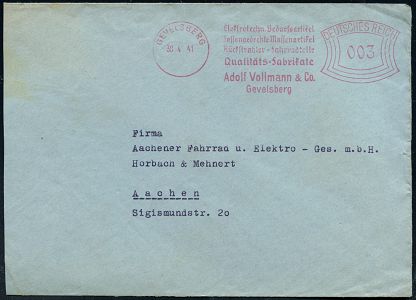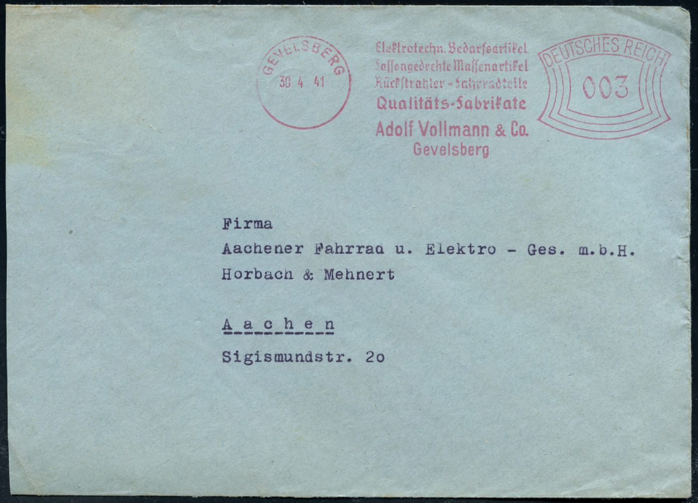 10766 | 20 € | PL-Raum 58 : GEVELSBERG/ Elektrotechn.Bedarfsartikel/ ..Rückstrahler-Fahrradteile/ ..Adolf Vollmann & Co 1941 (30.4.) AFS Francotyp "Bogenrechteck" , klar gest. Fern-Bf. (Dü.E-1CEo) | ![]() | |