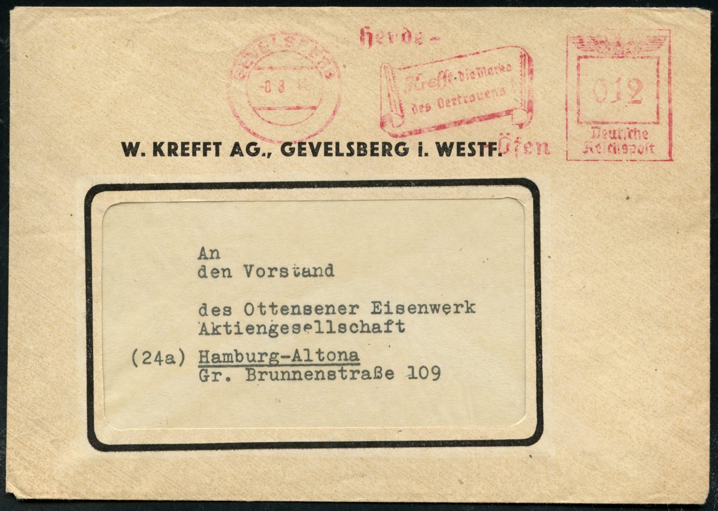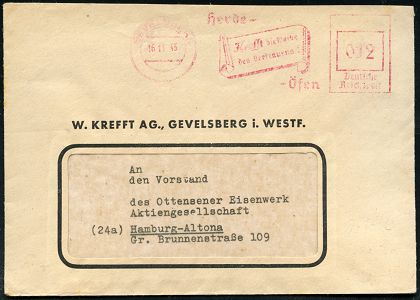 10767 | 20 € | PL-Raum 58 : GEVELSBERG/ Herde-/ Krefft - die Marke/ des Vertrauens/ -Öfen 1944 (8.8.) AFS Francotyp "Reichsadler" (zeitbedingt etw. schwach) Firmen-Fern-Bf., vergl. Kat.-Nr. 10768 (Dü.E-5CEo) | ![]() | |