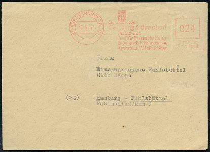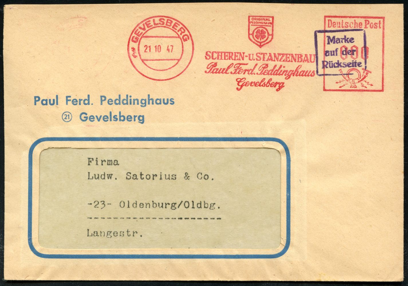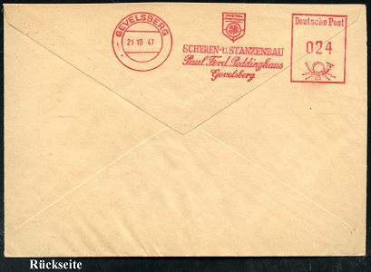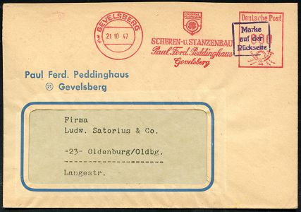 10770 | 25 € | PL-Raum 58 : GEVELSBERG/ SCHEREN-u.STANZENBAU/ Paul Ferd.Peddinghausen.. 1947 (21.10.) AFS Francotyp "Posthorn" in 000 + amtl., viol. Ra3: Marke/auf der/Rückseite , dort befindet sich der korrekte Freistempelabdruck mit 24 Pf. Gebühr!, seltene, vorschriftsmäßige Handhabung auf Fern-Bf. (Dü.E-20CGo) | ![]() ![]() | |