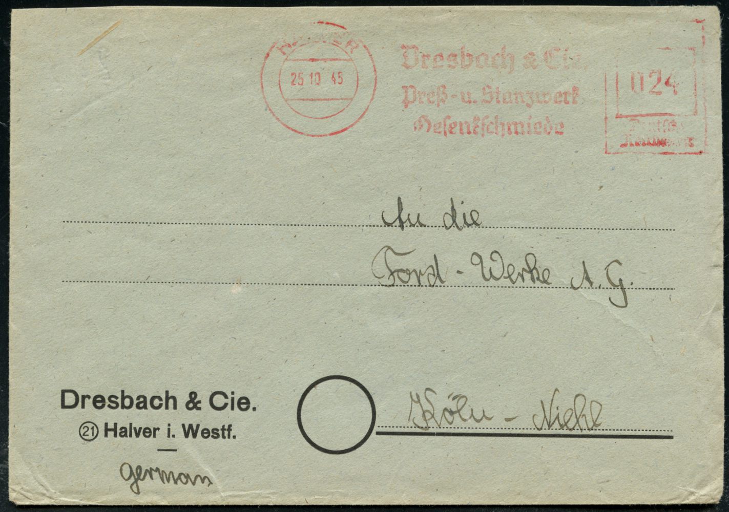 10776 | 20 € | PL-Raum 58 : HALVER/ Dresbach & Cie./ Preß-u.Stanzwerk/ Gesenkschmiede 1945 (25.10.) aptierter AFS Francotyp "Reichsadler" = entfernt = Notmaßnahme! , Firmen-Fern-Bf. an die Ford-Werke, Köln (Dü.E-13 J-129o) | ![]() | |