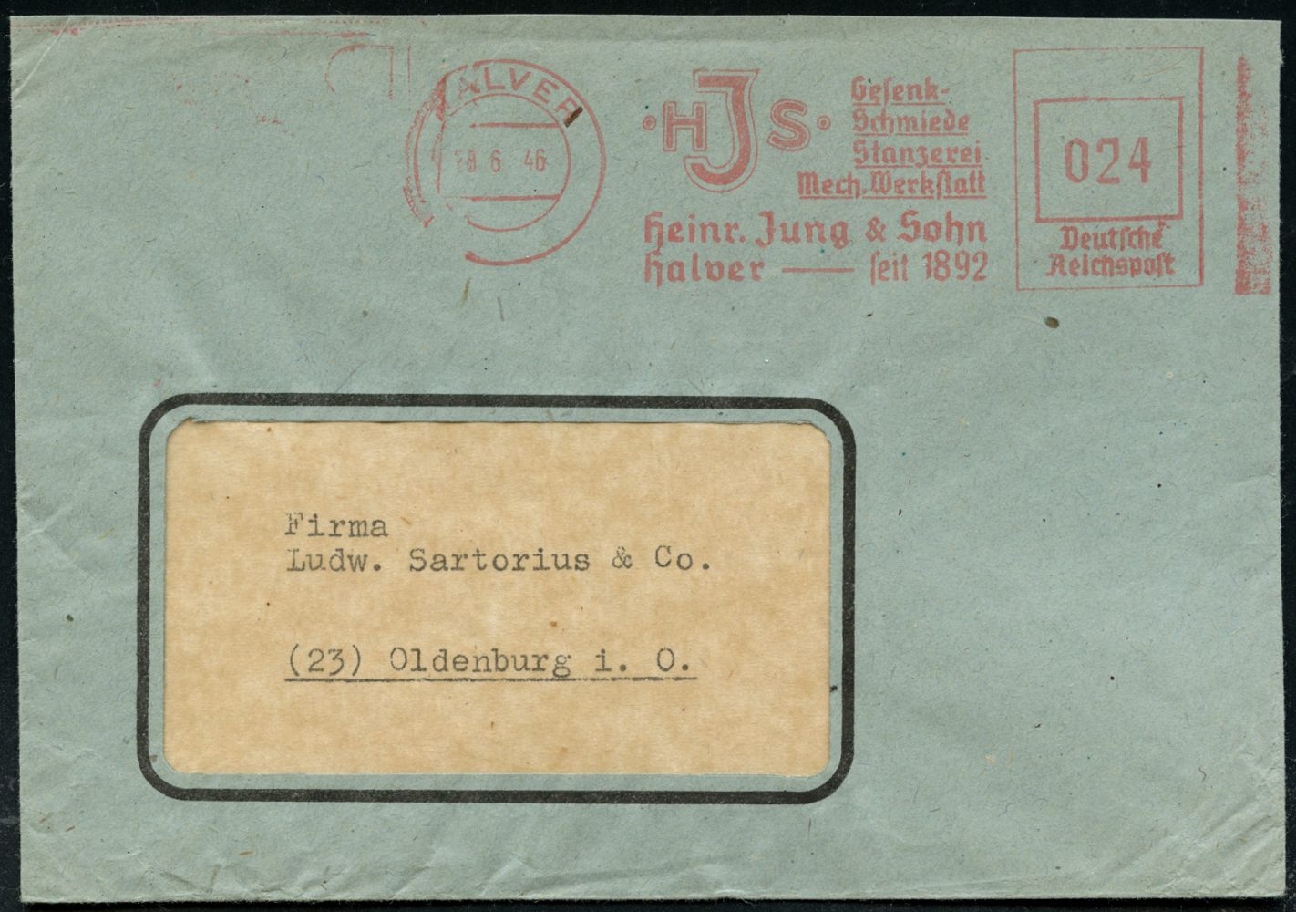 10777 | 20 € | PL-Raum 58 : HALVER/ HJS/ Gesenk-/ Schmiede/ Stanzerei/ Mech.Werkstatt/ Heint.Jung & Sohn.. 1946 (28.6.) aptierter AFS Francotyp "Reichsadler" = entfernt = Notmaßnahme! (Monogr.-Logo) Fern-Bf. (Dü.E-13 J-129o) | ![]() | |