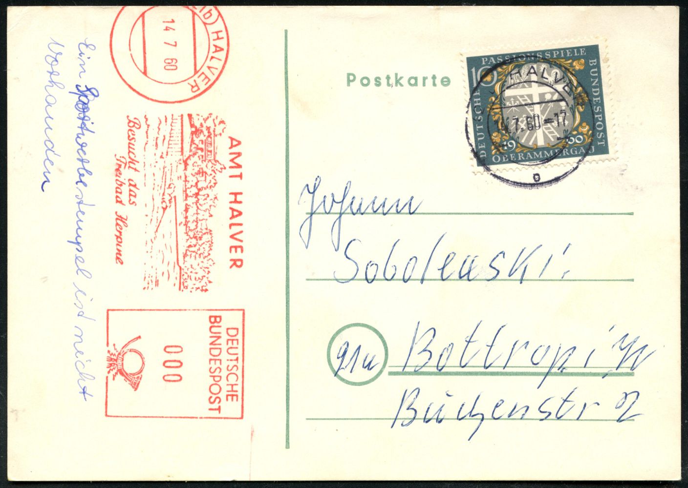 10778 | 16 € | PL-Raum 58 : (21b) HALVER/ o 1960 (14.7.) 2K-Steg + Musterabdruck: (21 b) HALVER/ AMT HALVER/ Besucht das/Freibad Herpine (Strandbad) in 000 u. Hinweis: "Ein Sportwerbestempel ist nicht vorhanden", Fern-Kt., Unikat! (Dü.E-23 B) | ![]() | |