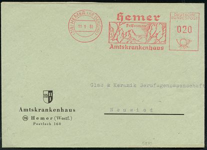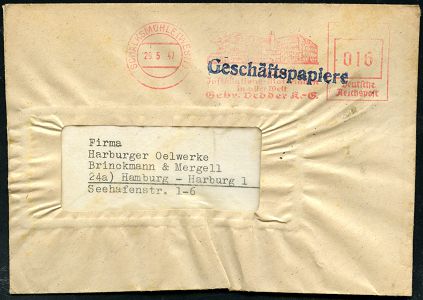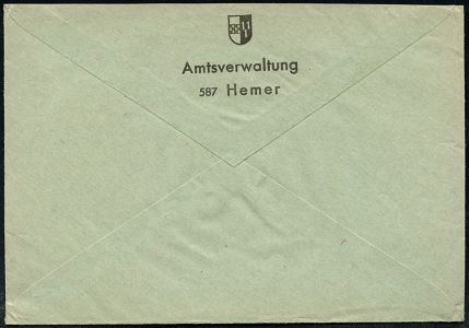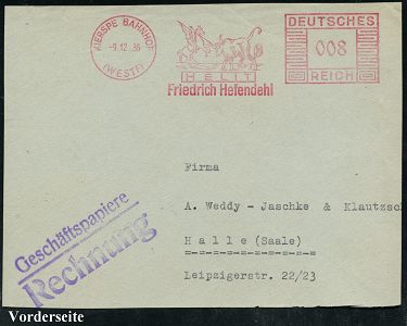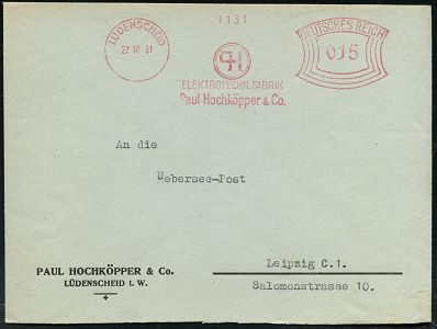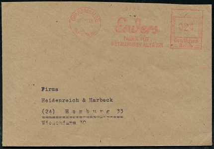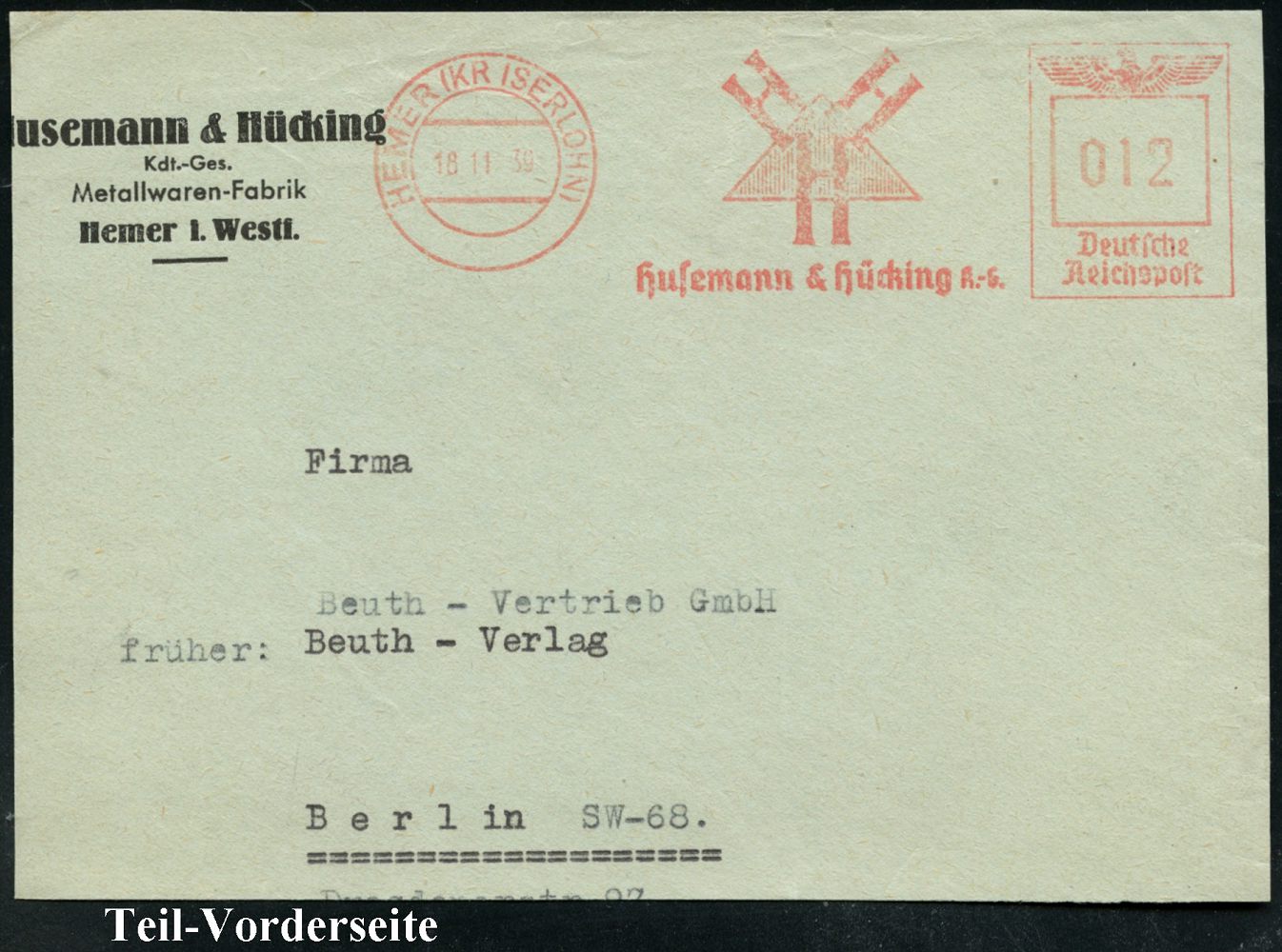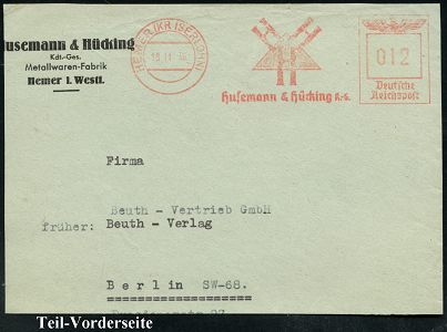 10783 | 14 € | PL-Raum 58 : HEMER (KR ISERLOHN)/ HHH/ Husemann 6 Hücking KG. 1939 (18.11.) AFS Francotyp "Reichsadler" (Monogr.-Logo = Metallwaren-Fabrik) auf Teil-Vorderseite (Dü.E-5CGo) | ![]() | |
