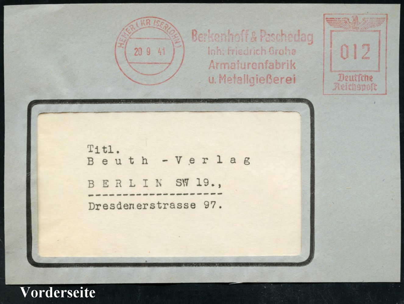 10785 | 12 € | PL-Raum 58 : HEMER (KR ISERLOHN)/ Berkenhoff & Paschedag/ Inh.: Friedrich Grohe/ Armaturen/ u.Metallgießerei 1941 (20.9.) AFS Francotyp "Reichsadler" , kleine Bedarfs-Vorderseite (Dü.E-5CGo) | ![]() | |