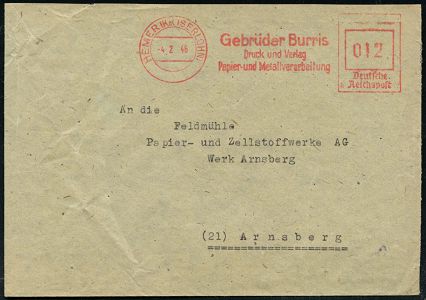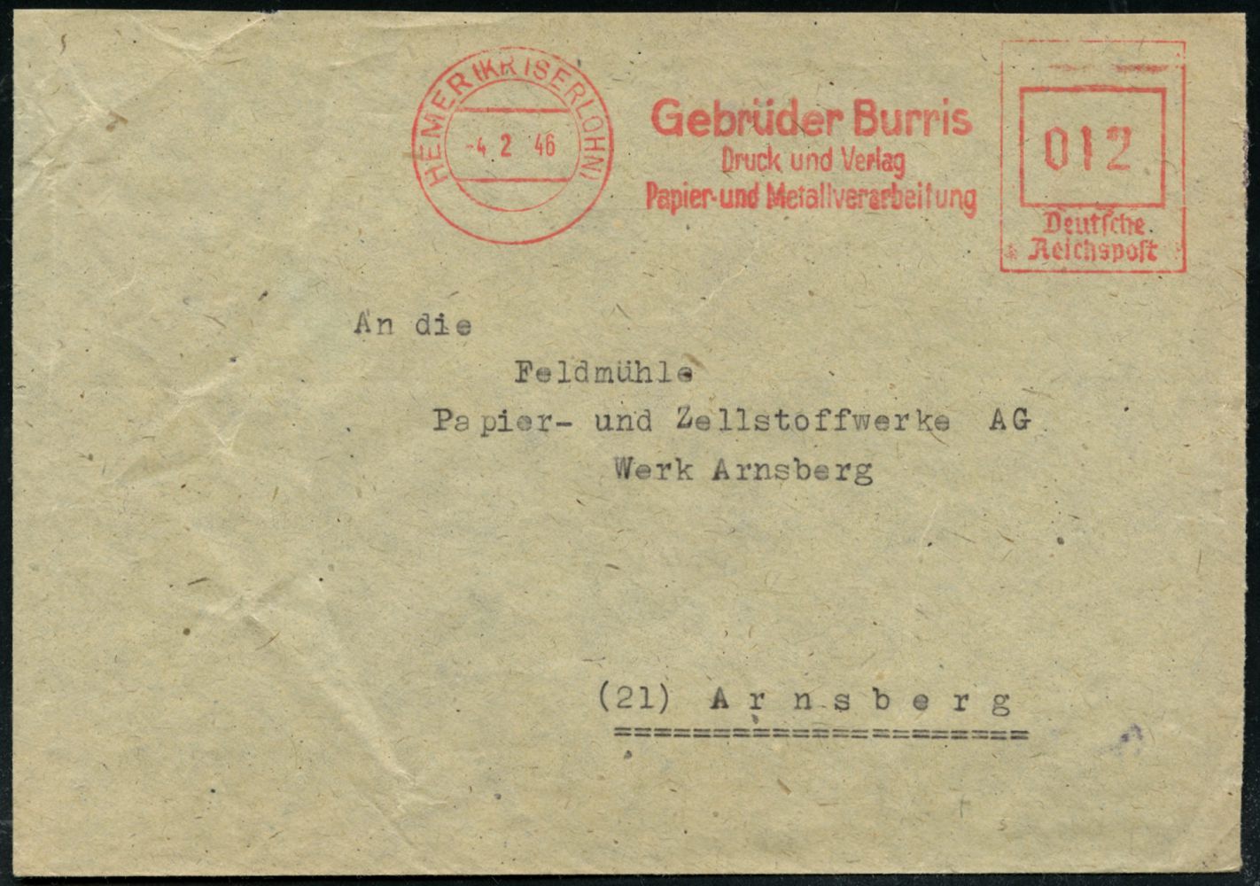 10786 | 22 € | PL-Raum 58 : HEMER (KR ISERLOHN)/ Gebrüder Burris/ Druck u.Verlag/ Papier-u.Metallverarbeitung 1946 (4.2.) aptierter AFS Francotyp "Reichsadler" = entfernt = Notmaßnahme! , rs. Abs.-Vordruck (kl. Klappenausriß) Fern-Bf. (Dü.E-13 J-129o) | ![]() | |