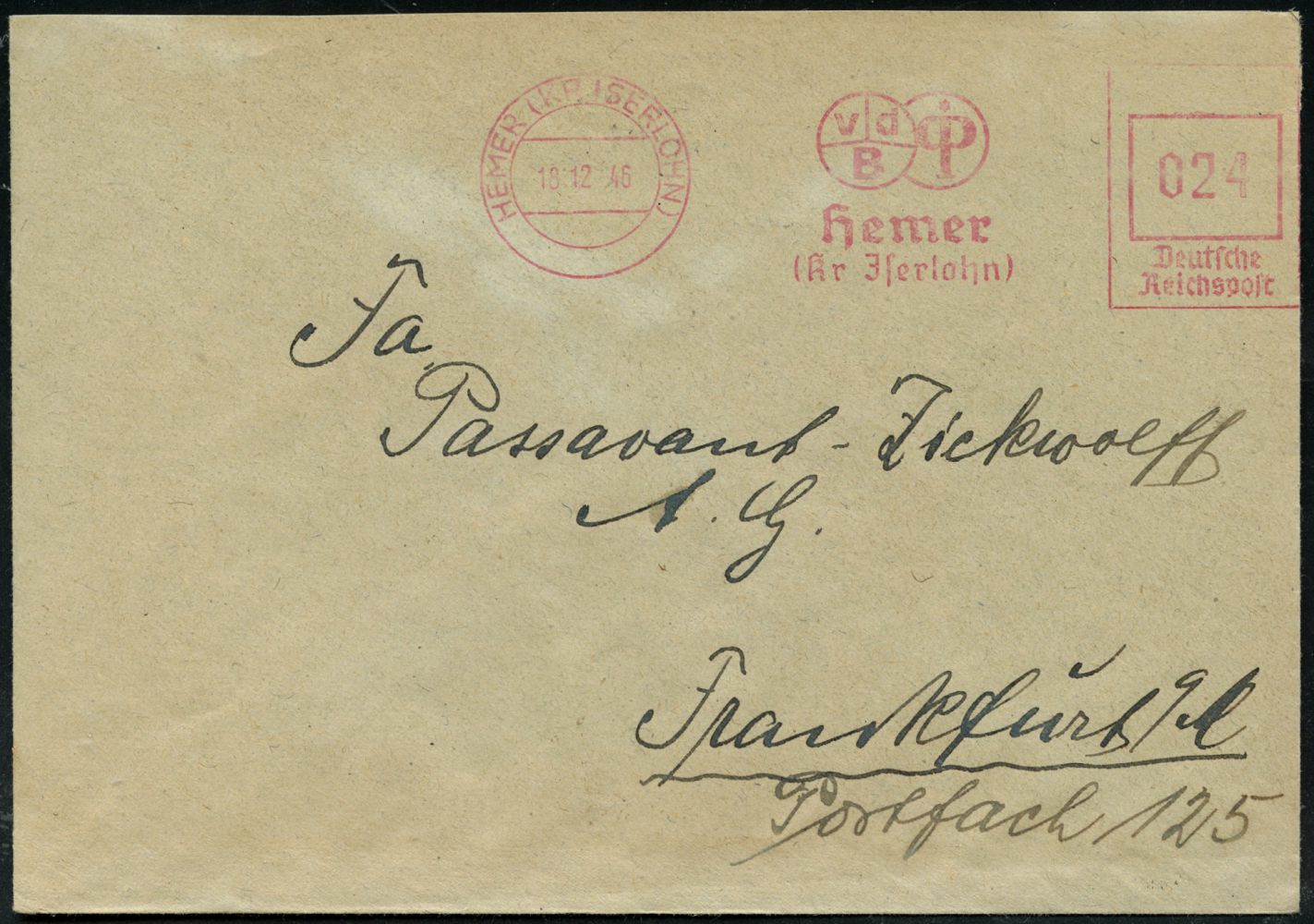10787 | 25 € | PL-Raum 58 : HEMER (KR ISERLOHN)/ v d/ B P/ Hemer.. 1946 (18.12.) aptierter AFS Francotyp "Reichsadler" = entfernt = Notmaßnahme! (Monogr.-Logo) rs. motivgl. Abs.-Vordruck: Becke-Prinz GmbH, Werk Hemer, Fern-Bf. (Dü.E-13 J-129o) | ![]() ![]() | |
