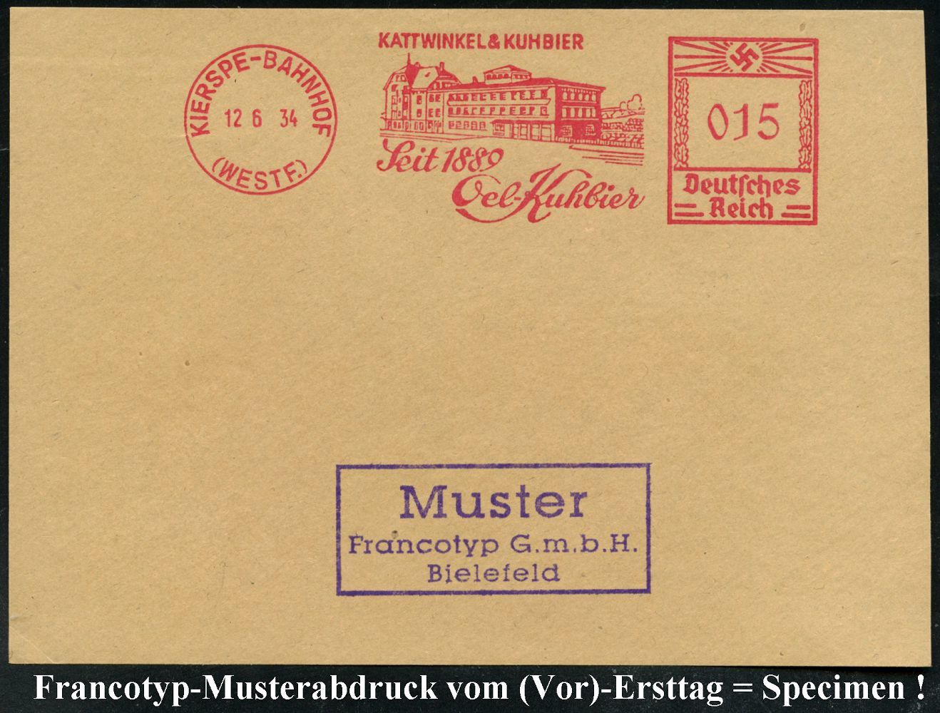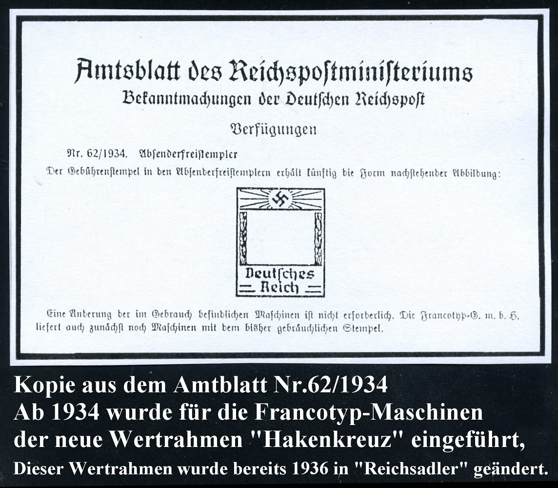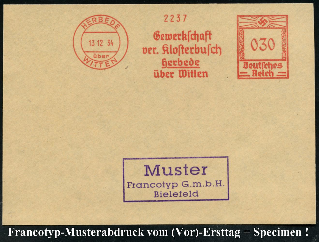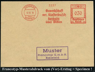 10792 | 35 € | PL-Raum 58 : HERBEDE/ über/ WITTEN/ Gewerkschaft/ ver.Klosterbusch.. 1934 (13.12.) AFS-Musterabdruck Francotyp "Hakenkreuz" = PSt.I-Typ , glasklar gest. Francotyp-Musterblatt vom (Vor)-Ersttag !, selten! (Dü.E-3CEh) | ![]() ![]() | |