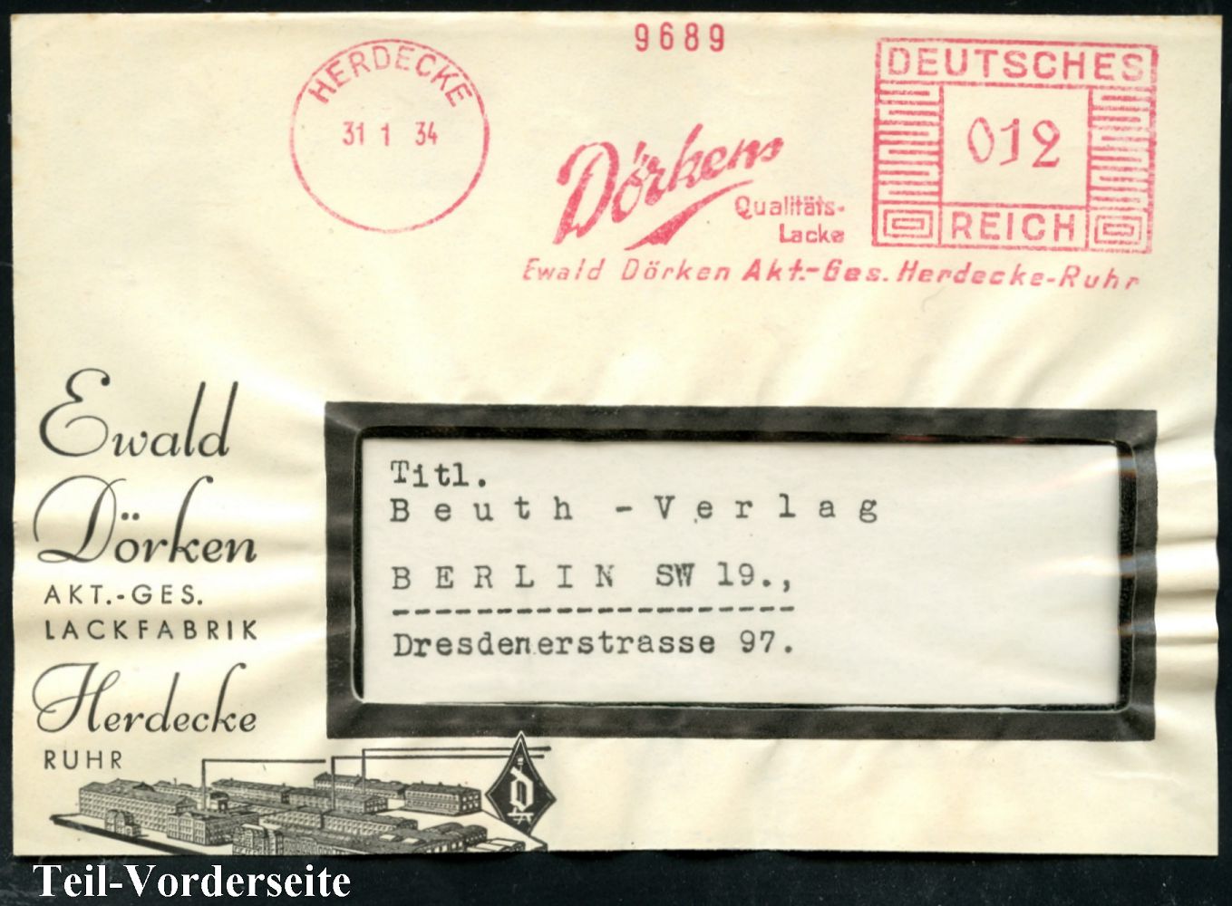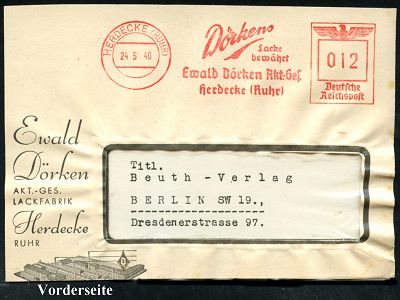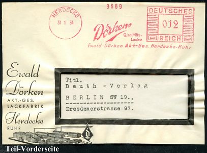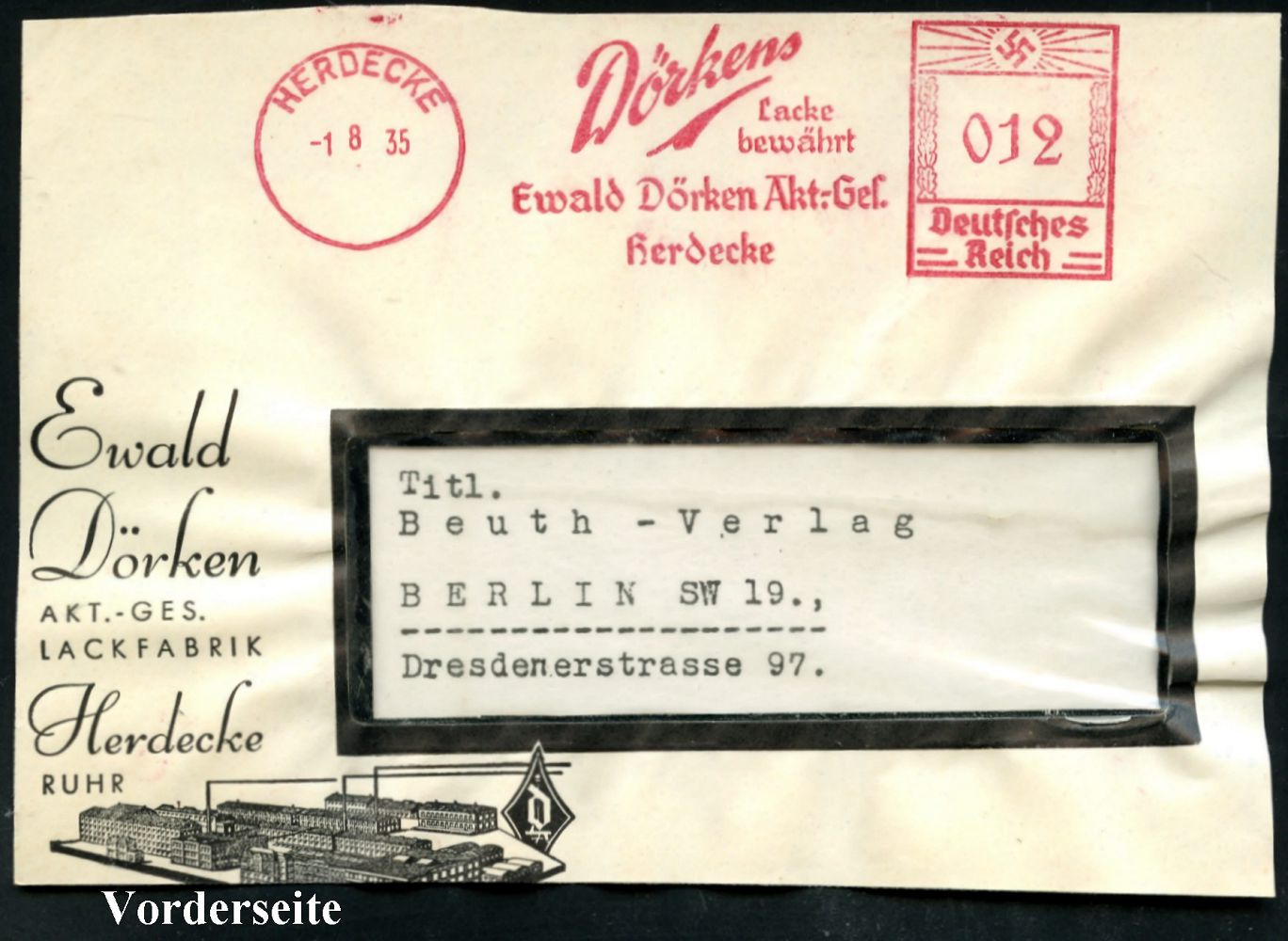 10795 | 30 € | PL-Raum 58 : HERDECKE/ Dörkens/ ..Lacke/ Ewald Dörken AG.. 1934/40 3 verschiedene AFS Francotyp "Mäanderrechteck", "Hakenkreuz" u. "Reichsadler" , je klar auf Teil-Vorderseite mit Abb. des Werksgeländes, 3 Belege (Dü.E-2CEh, E-3CEo, E-5CGo) | ![]() ![]() ![]() | |