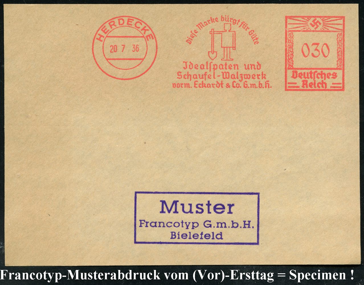 10796 | 35 € | PL-Raum 58 : HERDECKE/ ..Jdealspaten u./ Schaufel-Walzwerk/ vorm.Eckardt & Co... 1936 (20.7.) AFS-Musterabdruck Francotyp "Hakenkreuz" (Figur mit Spaten) glasklar gest. Francotyp-Musterblatt vom (Vor)-Ersttag !, selten! (Dü.E-3CEh) | ![]() ![]() | |