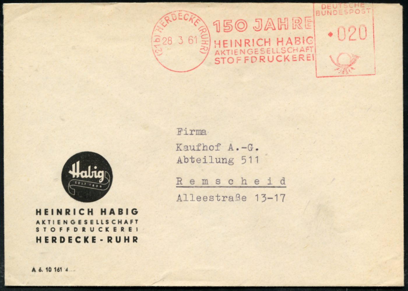 10798 | 16 € | PL-Raum 58 : (21b) HERDECKE (RUHR)/ 150 JAHRE/ HEINRICH HABIG/ AG/ STOFFDRUCKEREI 1961 (28.3.) Jubil.-AFS Francotyp "Posthorn" auf Firmen-Bf. mit Firmen-Logo, vergl. Kat.-Nr. 10794,, 10797 (Dü.E-23DO) | ![]() | |