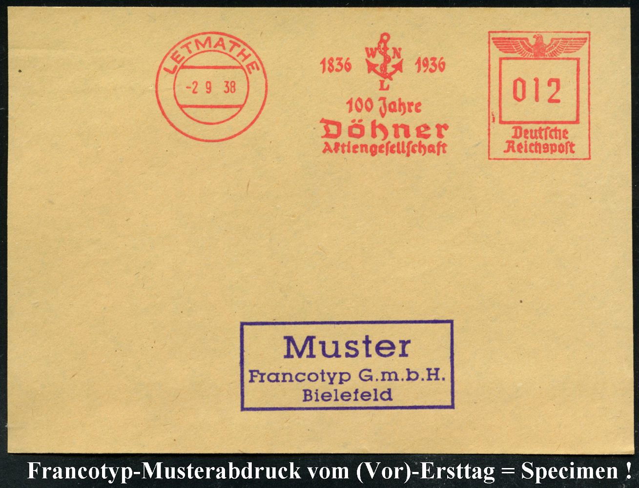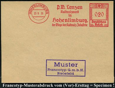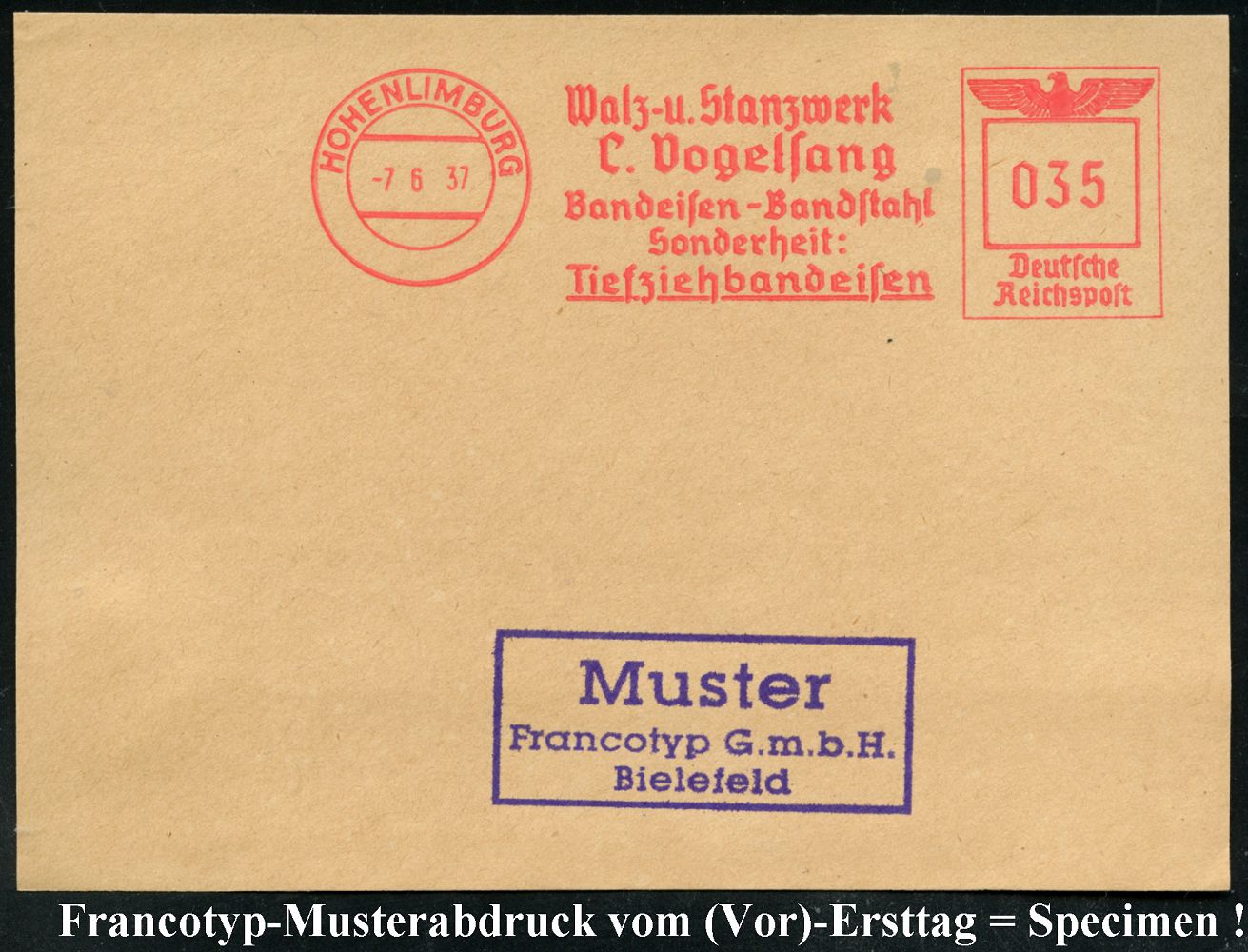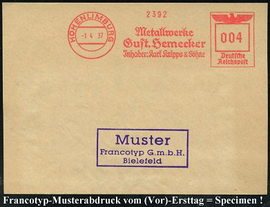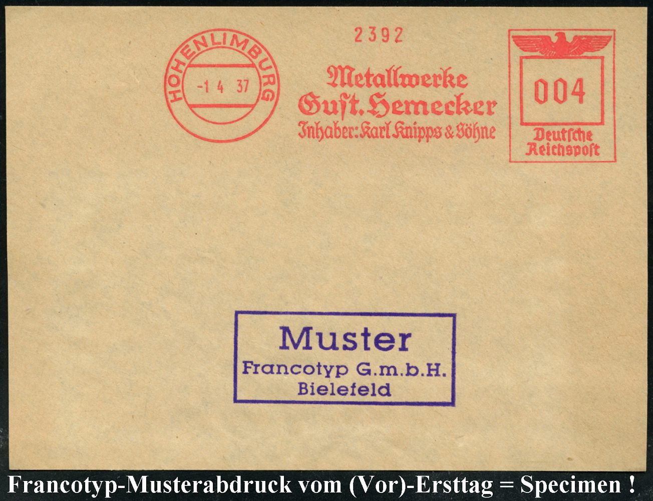 10804 | 35 € | PL-Raum 58 : HOHENLIMBURG/ Metallwerke/ Gust.Hemecker/ Jnhaber: Karl Knipps & Söhne 1937 (1.4.) AFS-Musterabdruck Francotyp "Reichsadler" , glasklar gest. Francotyp-Musterblatt vom (Vor)-Ersttag !, selten! (Dü.E-5CGh) | ![]() ![]() | |