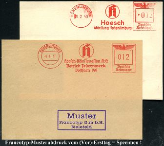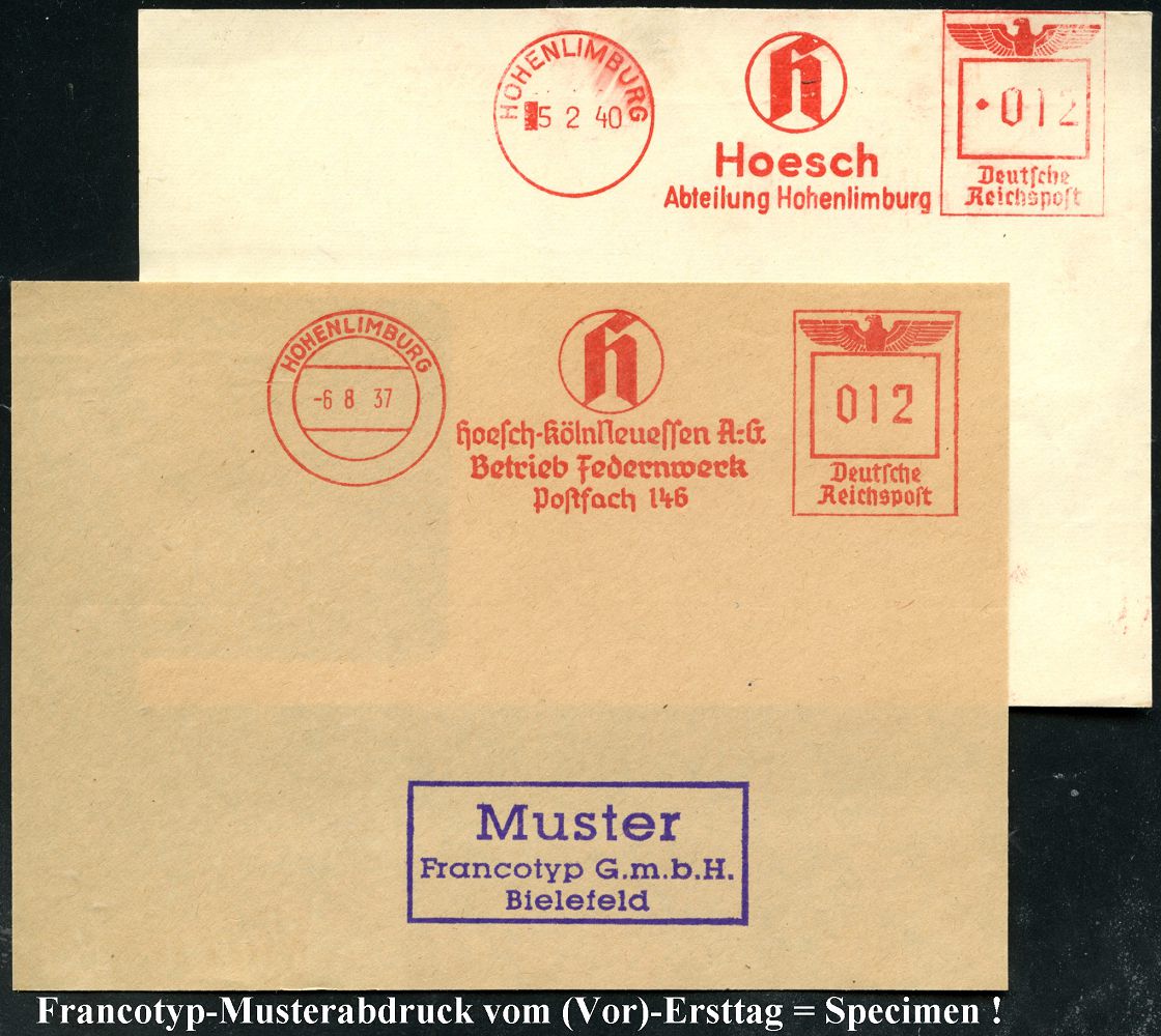 10807 | 35 € | PL-Raum 58 : HOHENLIMBURG/ Hoesch-Köln Neuessen AG/ Betrieb Federnwerk.. 1937 (6.8.) AFS-Musterabdruck Francotyp "Reichsadler" (Monogr.-Logo) glasklar gest. Francotyp-Musterblatt vom (Vor)-Ersttag !, selten! (Dü.E-5CGo) | ![]() ![]() | |