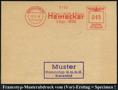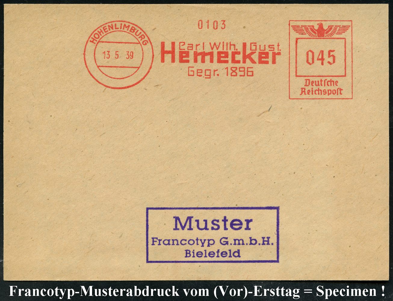10809 | 35 € | PL-Raum 58 : HOHENLIMBURG/ Carl Wilh.Gust./ Hemecker/ Gebr.1896 1939 (13.5.) AFS-Musterabdruck Francotyp "Reichsadller" , glasklar gest. Francotyp-Musterblatt vom (Vor)-Ersttag ! selten! (Dü.E-5CGh) | ![]() ![]() | |