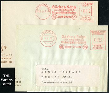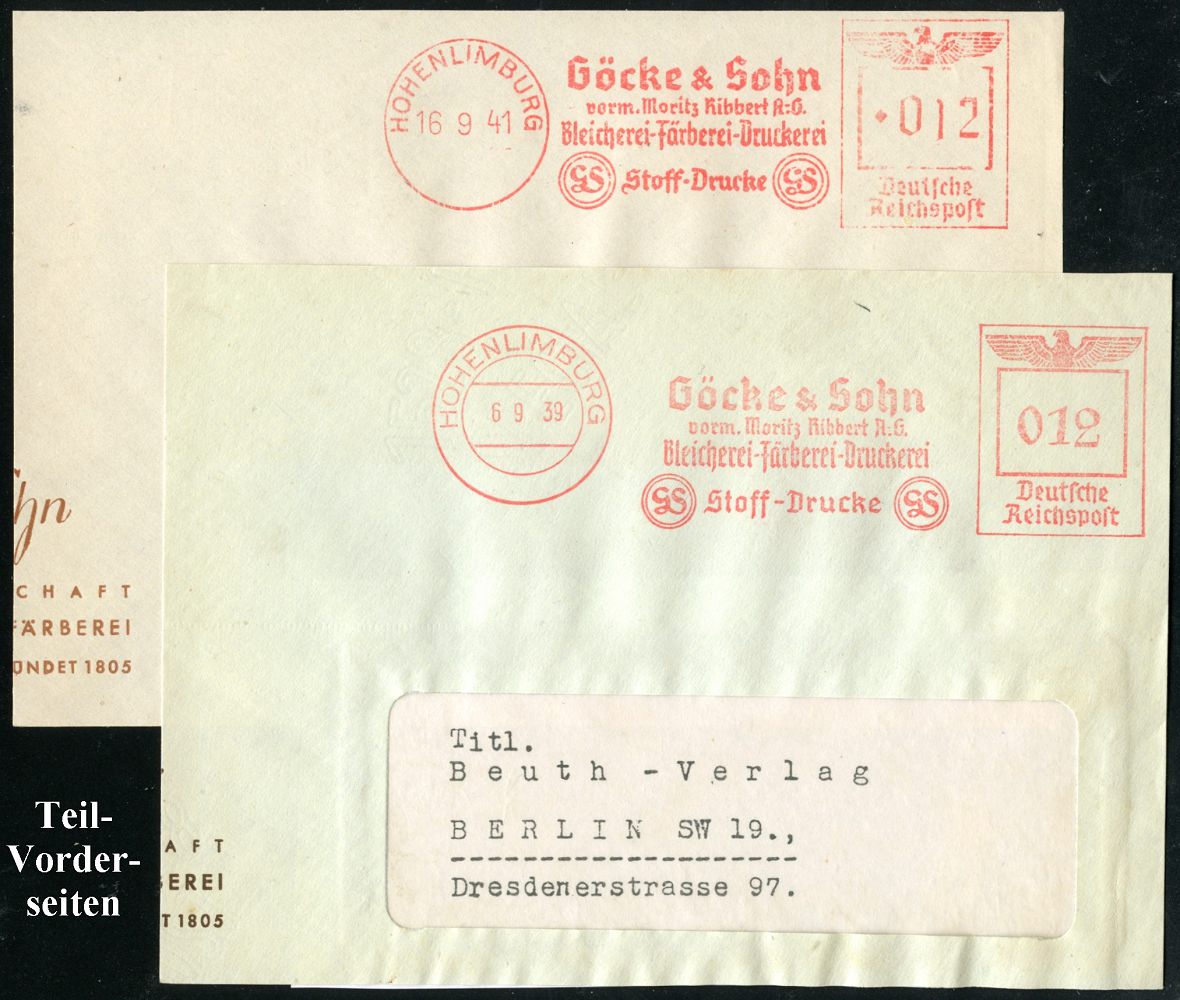 10810 | 20 € | PL-Raum 58 : HOHENLIMBURG/ Göcke & Sohn../ Bleicherei-Färberei-Druckerei/ Stoff-Drucke 1939/41 2 verschiedene AFS Francotyp "Reichsadler" (je Monogr.-Logo) je auf Teil-Vorderseite, 2 Belege (Dü.E-5CAo, E-5DGo) | ![]() | |