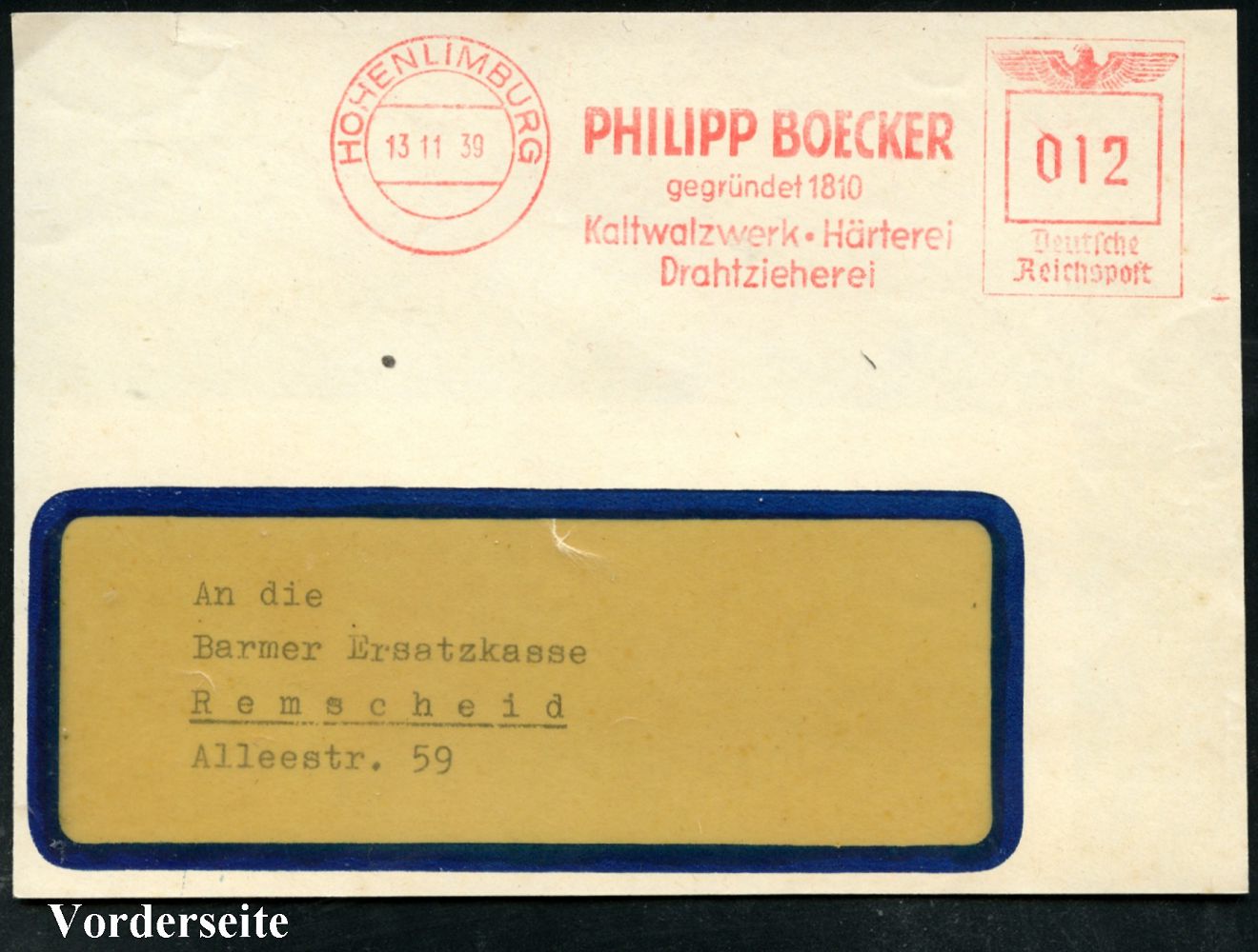 10811 | 12 € | PL-Raum 58 : HOHENLIMBURG/ PHILIPP BOCKER/ gegründet 1810/ Kaltwalzwerk-Härterei/ Drahtzieherei 1939 (13.11.) AFS Francotyp "Reichsadler" , kleine Bedarfs-Vorderseite (Dü.E-5CGo) | ![]() | |