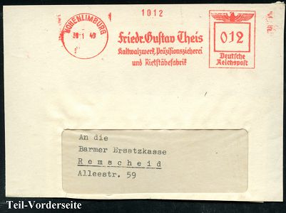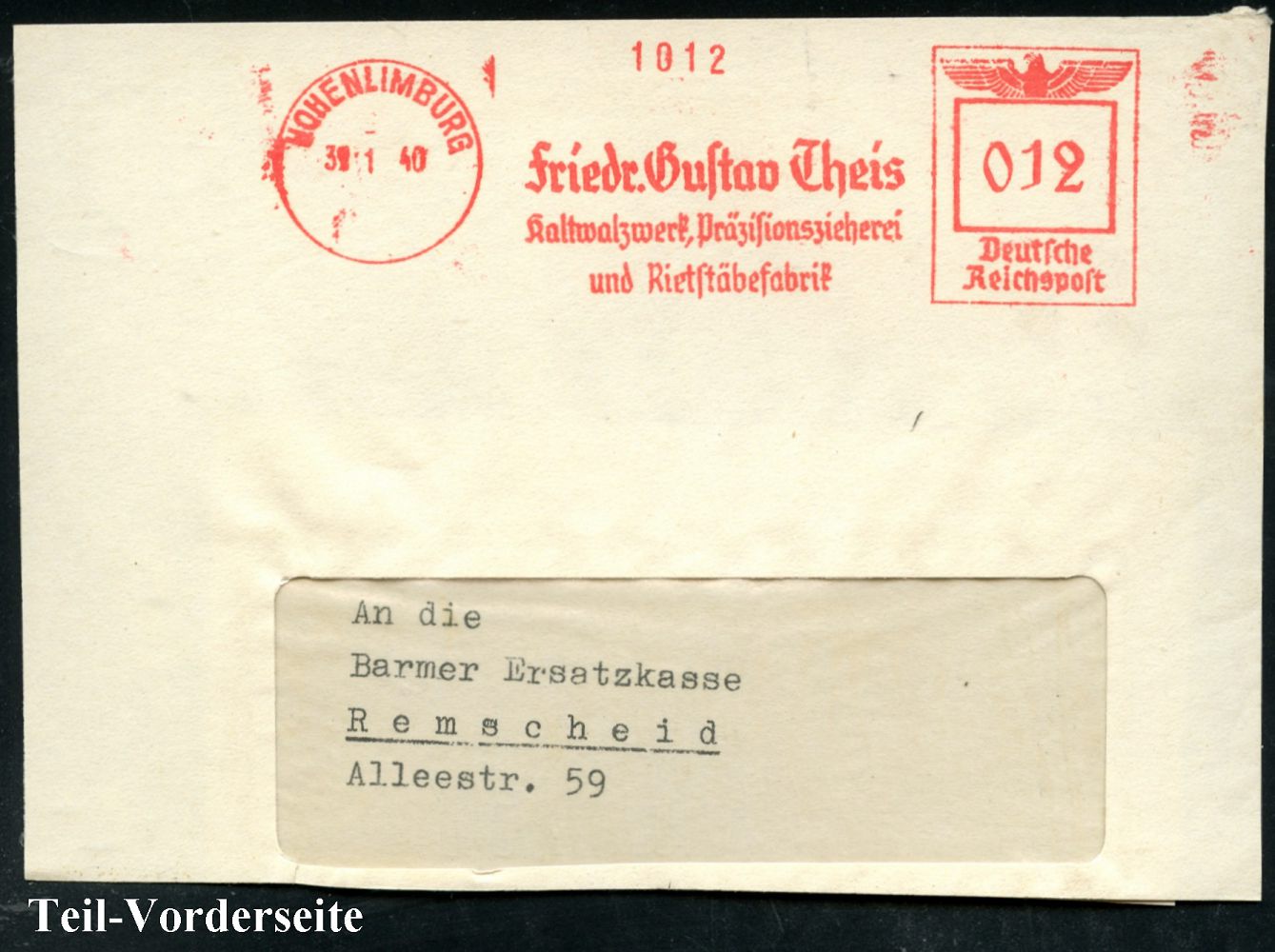 10812 | 12 € | PL-Raum 58 : HOHENLIMBURG/ Friedr.Gustav Theis/ Kaltwalzwerk,Präzisionsziegerei/ u,Rietstäbefabrik 1940 (31.1.) AFS Francotyp "Reichsadler" , kleine Bedarfs-Vorderseite (Dü.E-5CEh) | ![]() | |