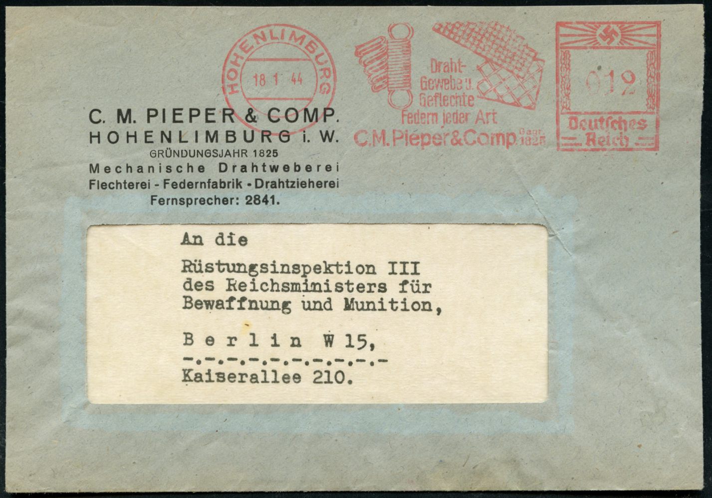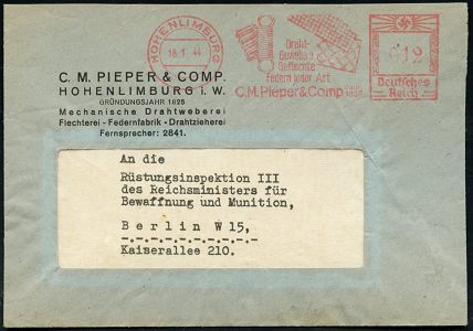 10816 | 25 € | PL-Raum 58 : HOHENLIMBURG/ Draht-/ Gewebe/ Geflechte/ Federn jeder Art/ C.M.Pieper & Comp. 1944 (18.1.) AFS Francotyp "Hakenkreuz" (div. Drahtgeflechte u. Federn) Firmen-Fern-Bf., vergl. Kat.-Nr. 10818 (Dü.E-3CEo) | ![]() | |