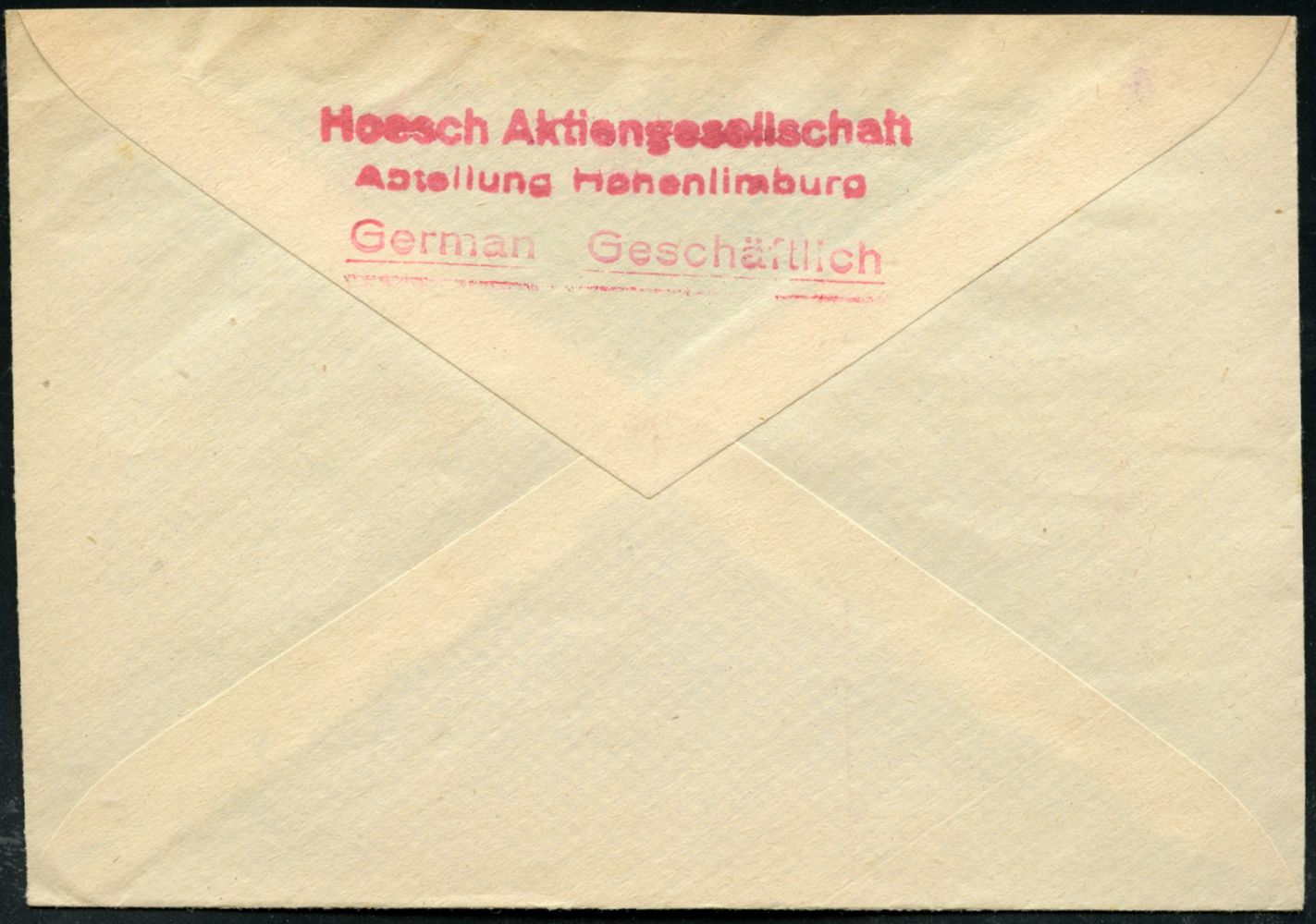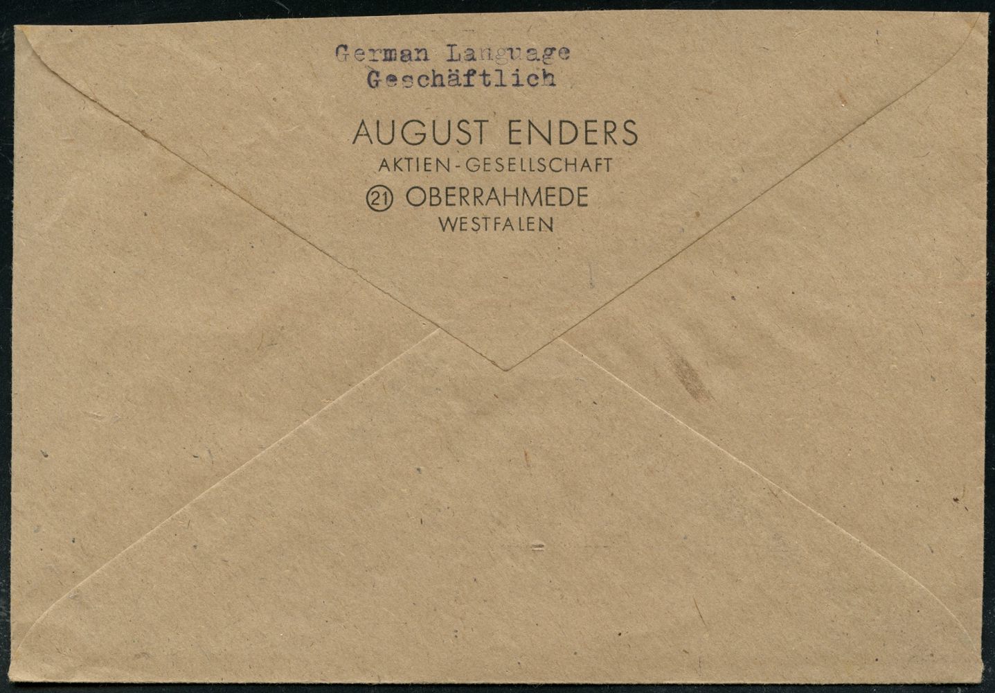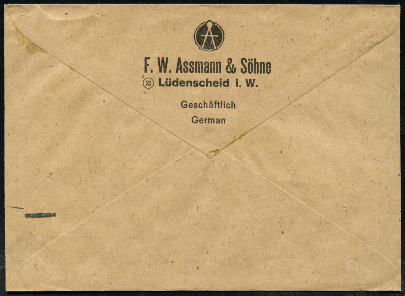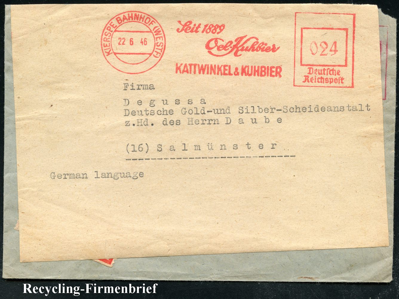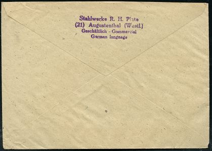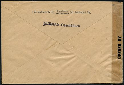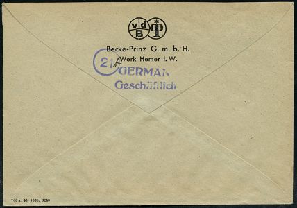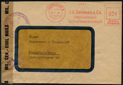 10834 | 25 € | PL-Raum 58 : ISERLOHN 1/ J.G.Dahmen & Co./ Metallwalzwerk/ Grob-u.Feindrahtzieherei 1946 (23.4.) aptierter AFS Francotyp "Reichsadler" = entfernt = Notmaßnahme! + US-Eingangszensur, Klebestreifen: OPENED BY/ MIL. CEN.-CIVIL MAILS + viol. Zensur-1K (= Offenbach) , rs. Abs.-Vordruck, Inl.-Zensur-Bf.! (Dü.E-13 J-129h) | ![]() ![]() | |