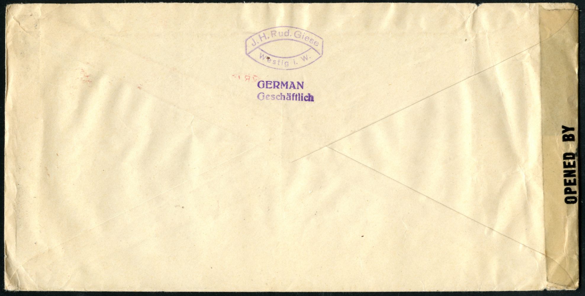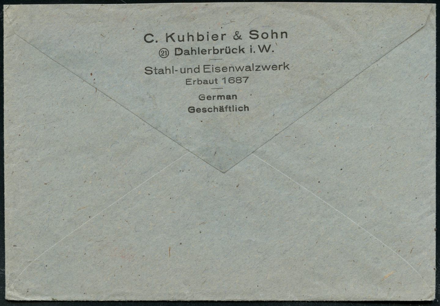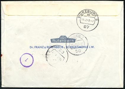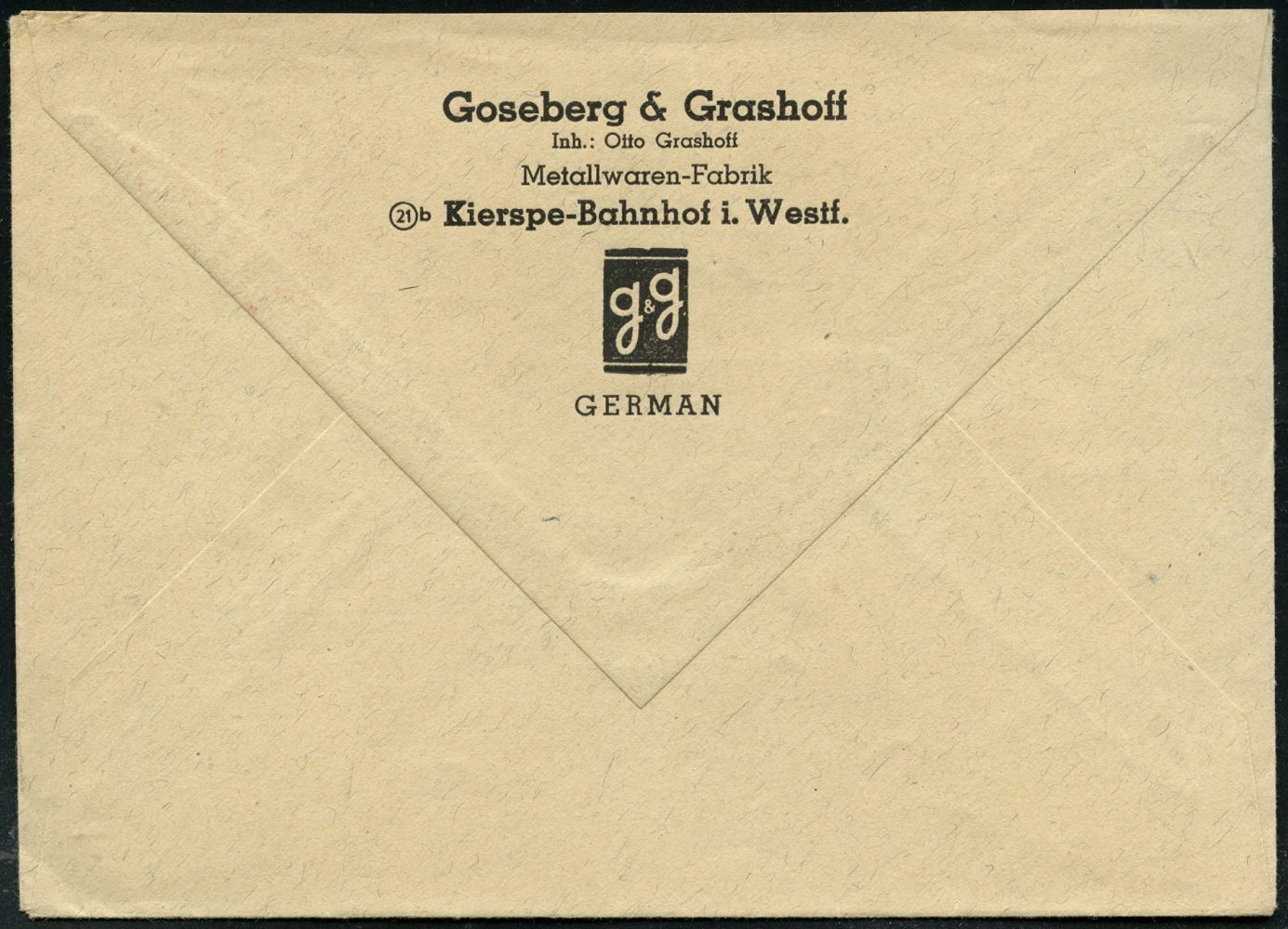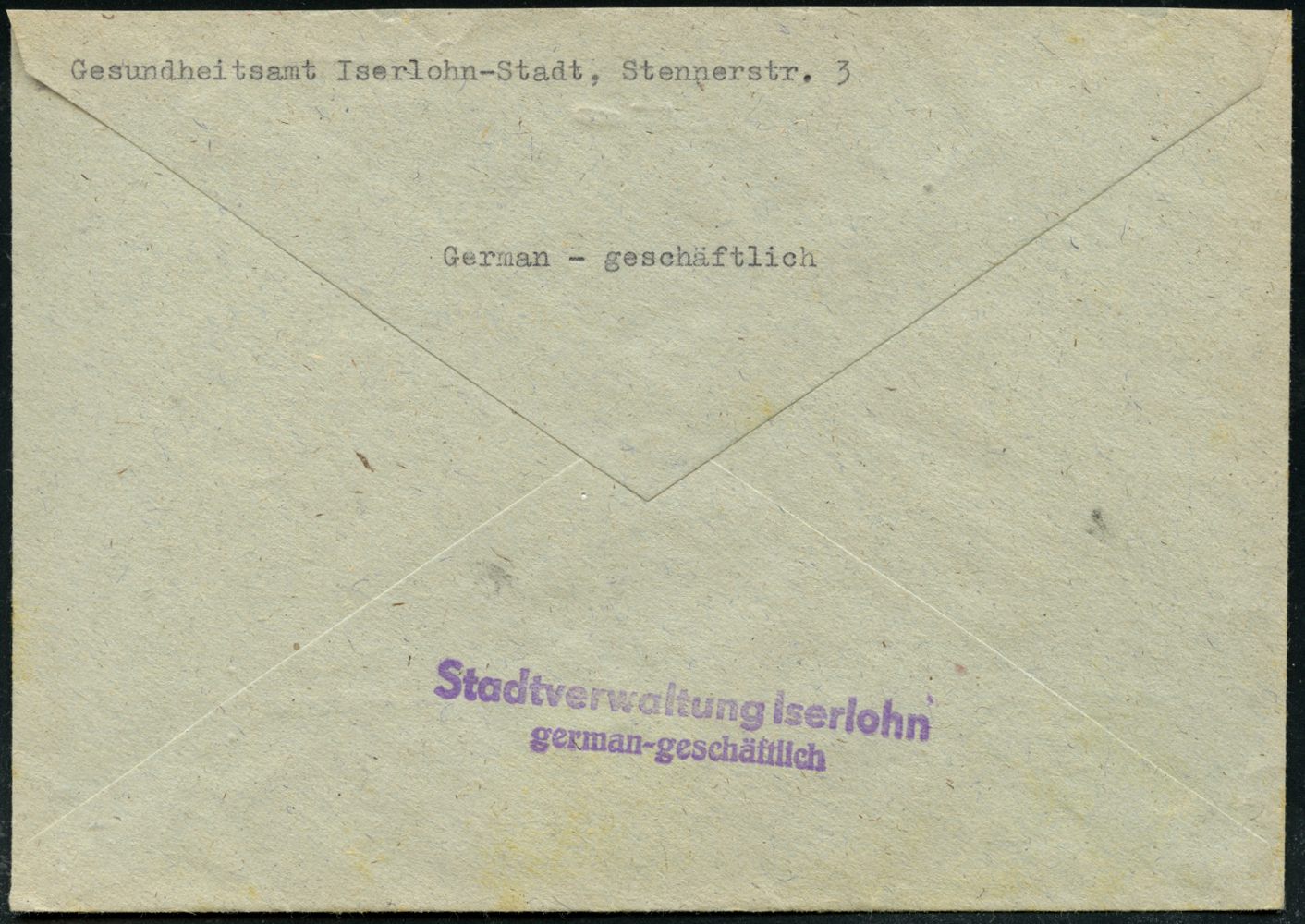 10834 | 25 € | PL-Raum 58 : ISERLOHN 1/ J.G.Dahmen & Co./ Metallwalzwerk/ Grob-u.Feindrahtzieherei 1946 (23.4.) aptierter AFS Francotyp "Reichsadler" = entfernt = Notmaßnahme! + US-Eingangszensur, Klebestreifen: OPENED BY/ MIL. CEN.-CIVIL MAILS + viol. Zensur-1K (= Offenbach) , rs. Abs.-Vordruck, Inl.-Zensur-Bf.! (Dü.E-13 J-129h) | ![]() ![]() | |