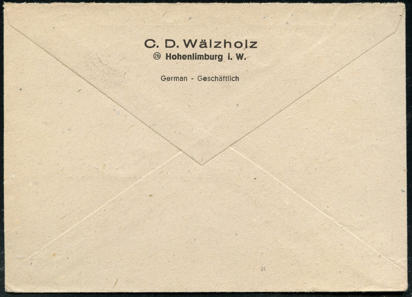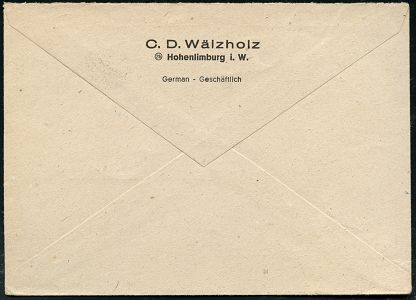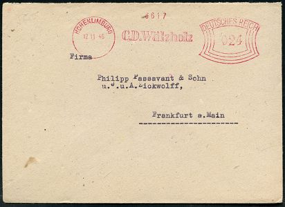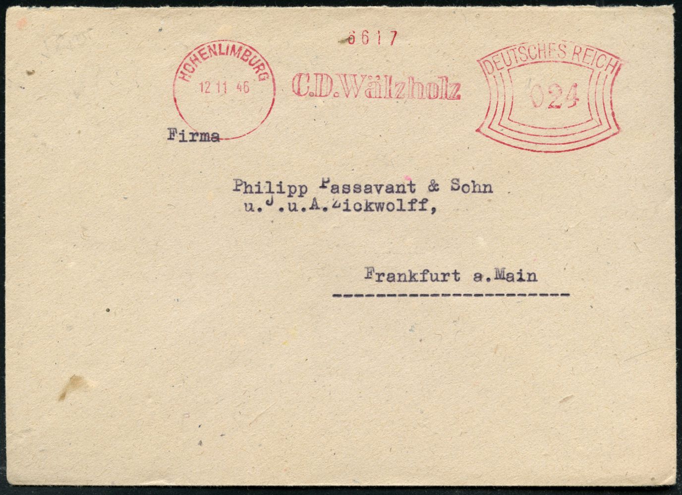10819 | 25 € | PL-Raum 58 : HOHENLIMBURG/ C.D.Wälzholz 1946 (12.11.) AFS Francotyp "Bogenrechteck" u n v e r ä n d e r t weiterverwendet mit Inschrift "DEUTSCHES REICH" = Notmaßnahme! , rs. Abs.-Vordruck, klar gest. Inl.-Bf. (Dü.E-1CEh, unverändert) | ![]() ![]() | |
