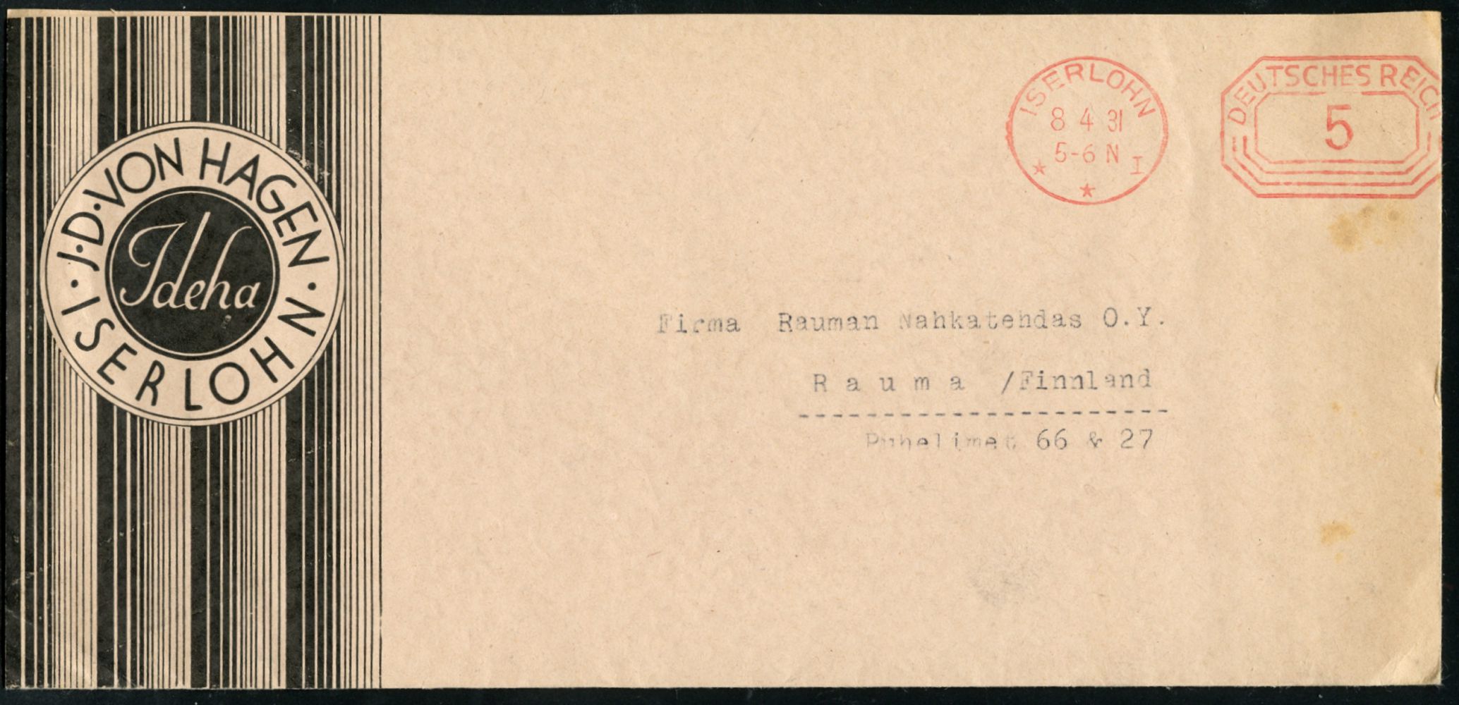 10825 | 18 € | PL-Raum 58 : ISERLOHN/ **I/ DEUTSCHES REICH 1931 (8.4.) PFS "Achteck" 5 (Pf.) auf dekorativem Ausl.-Drs.-Firmen-Bf.: J. D. VON HAGEN, Jdeha.. n. Finnland (Dü.D-4, Ausl.-Drs.-Tarif) | ![]() ![]() | |