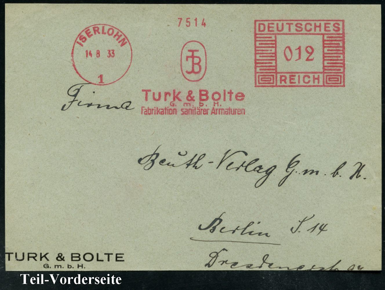 10826 | 14 € | PL-Raum 58 : ISERLOHN/ 1/ TB/ Turk & Bolte/ GmbH/ Fabrikation sanitärer Armaturen 1933 (14.8.) AFS Francotyp "Mäanderrechteck" (Monogr.-Logo) klar gest. Teil-Vorderseite (Dü.E-2CEh) | ![]() | |