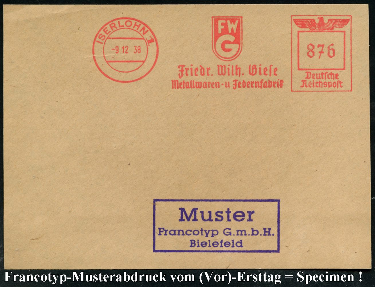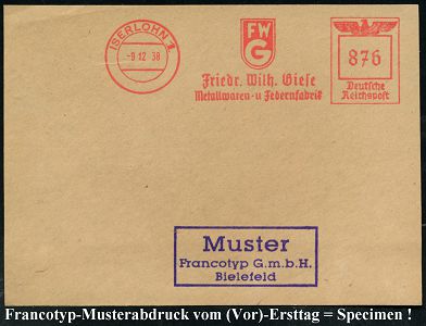 10829 | 35 € | PL-Raum 58 : ISERLOHN/ FWG/ Friedr.Wilh.Giese/ Metallwaren-u.Federnfabrik 1938 (9.12.) AFS-Musterabdruck Francotyp "Reichsadler" (Monogr.-Logo) glasklar gest. Francotyp-Musterblatt vom (Vor)-Ersttag !, selten! (Dü.E-5CGo) | ![]() ![]() | |