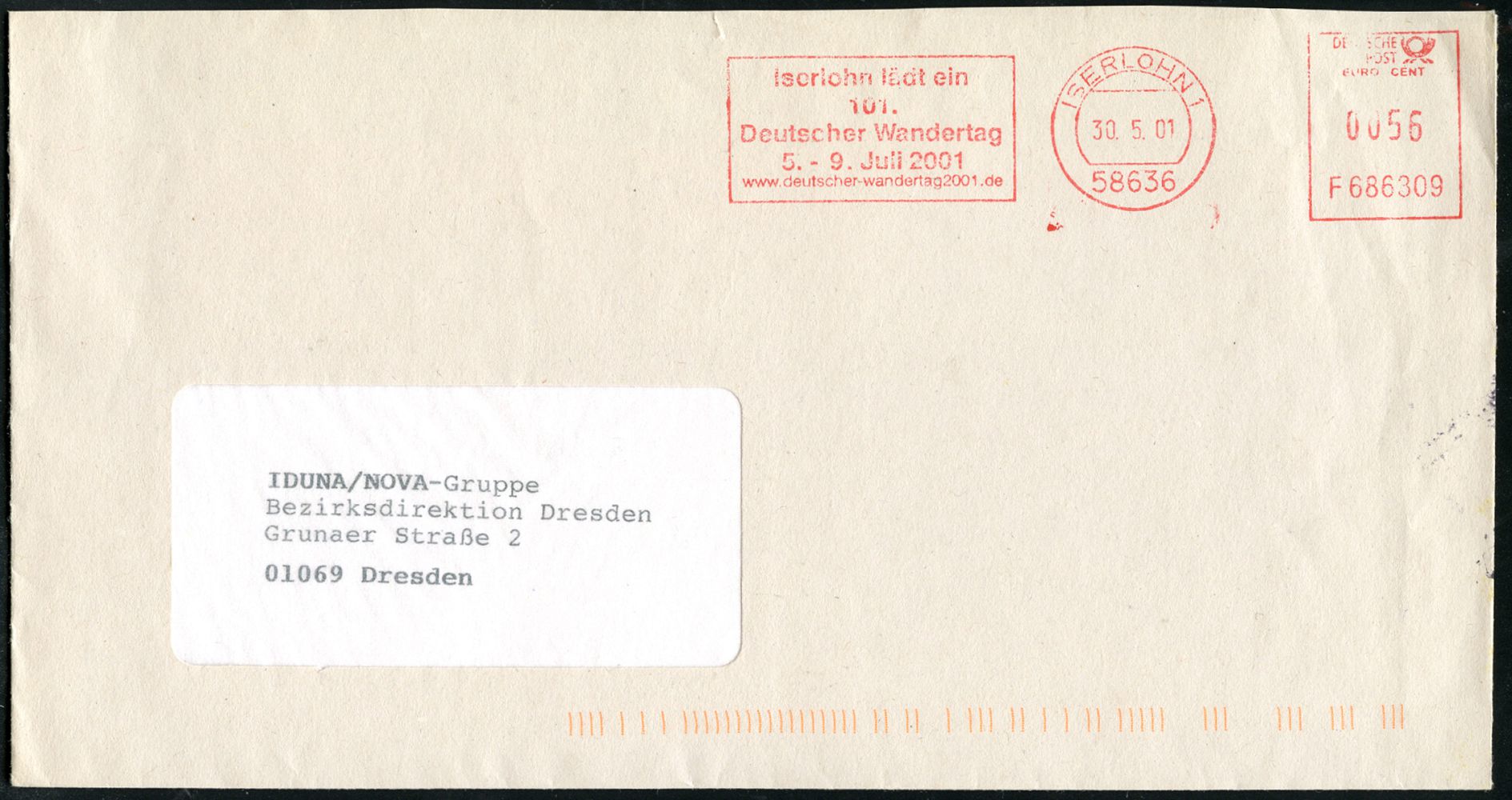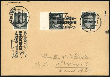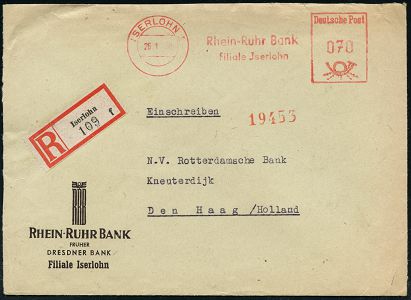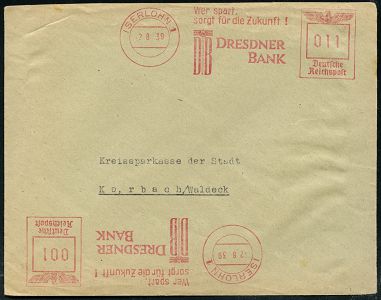 10832 | 25 € | PL-Raum 58 : ISERLOHN 1/ Wer spart,/ sorgt für die Zukunft!/ DB/ DRESDNER/ BANK 1939 (2.8.) AFS Francotyp "Reichsadler" 011 Pf. + 001 Pf. = 2 Abdrucke! (Monogr.-Logo) klar gest., portorichtiger Inl.-Fern-Bf., seltenes zusammengesetzes Porto! (Dü.E-5CGo) | ![]() | |