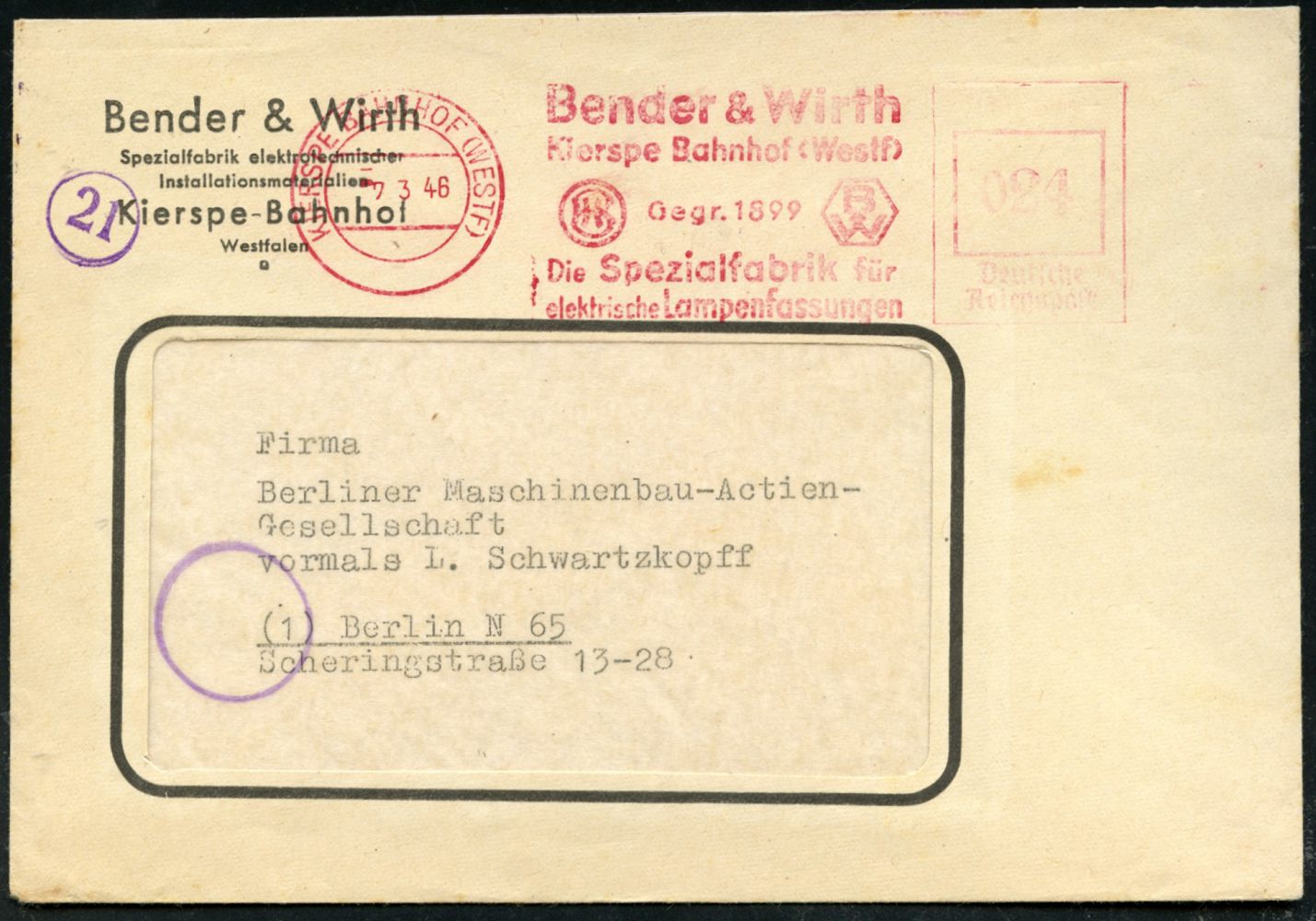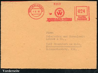 10971 | 18 € | PL-Raum 58 : WITTEN-ANNEN/ W/ WICKMANN-WERKE/ AG 1946 (1.8.) aptierter AFS Francotyp "Reichsadler" = entfernt = Notmaßnahme! (Monogr.-Logo mit Hand mit Blitzen = elektrotechn. Fabrik) Bedarfs-Vs. (kl. Rißchen geschl.) klar gest. Firmen-Vorderseite, vergl. Kat.-Nr. 10963, 10968, 10970 (Dü.E-13 R-129h = seltene Type!) | ![]() | |