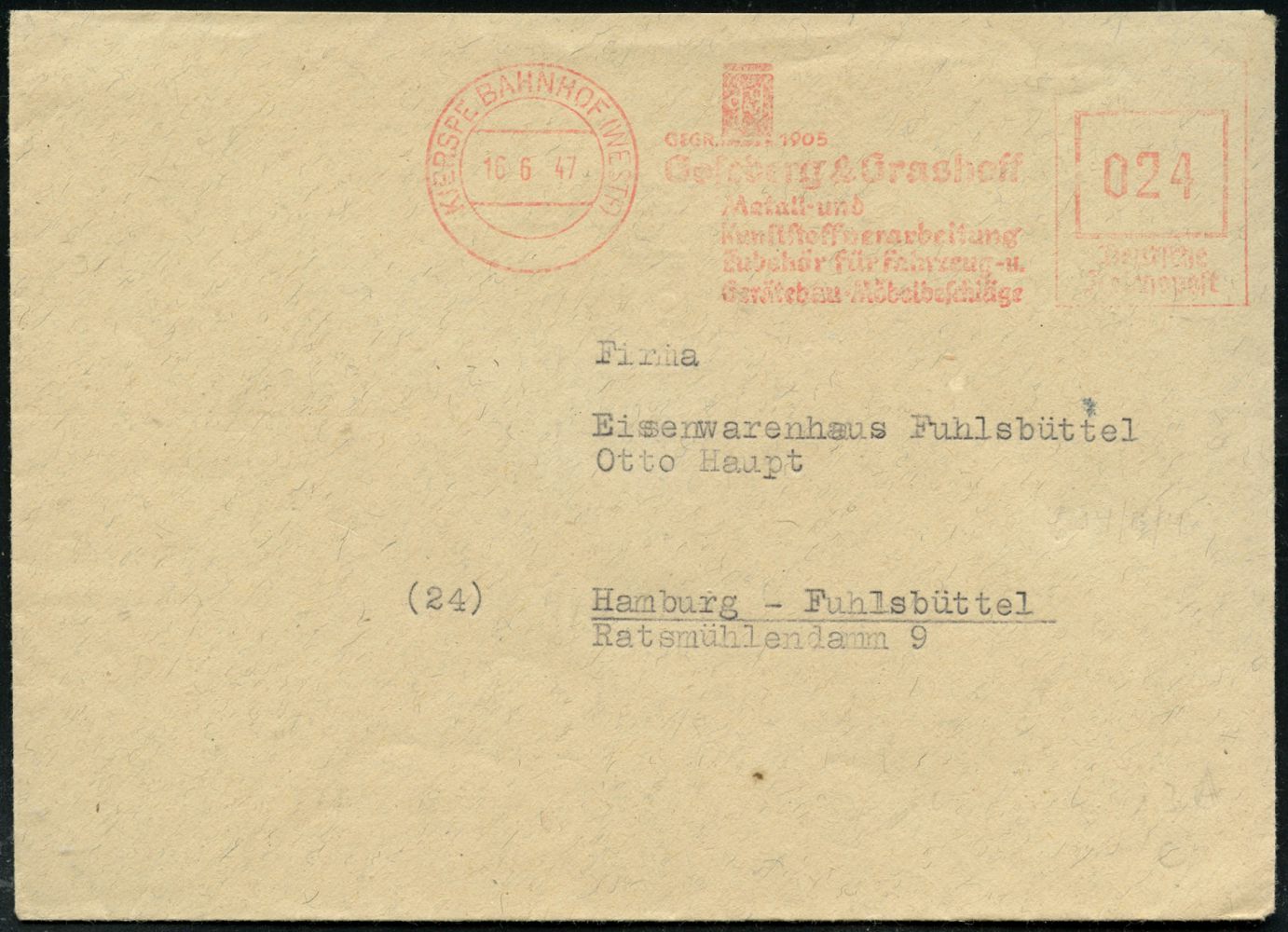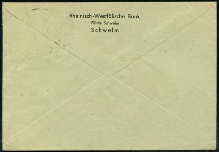 10921 | 20 € | PL-Raum 58 : SCHALKSMÜHLE (WESTF)/ ..Jnstallations-Materialien/ in aller Welt/ Gebr.Vedder K.G. 1947 (29.5.) aptierter AFS Francotyp "Reichsadler" = entfernt = Notmaßnahme! (Fabrik-Gebäude) rs. Abs.-Vordruck, Firmen-Bf. (natürliche Falten durch Klarsichtfenster) "Geschäftspapiere" (Dü.E-13 J-129o) | ![]() | |