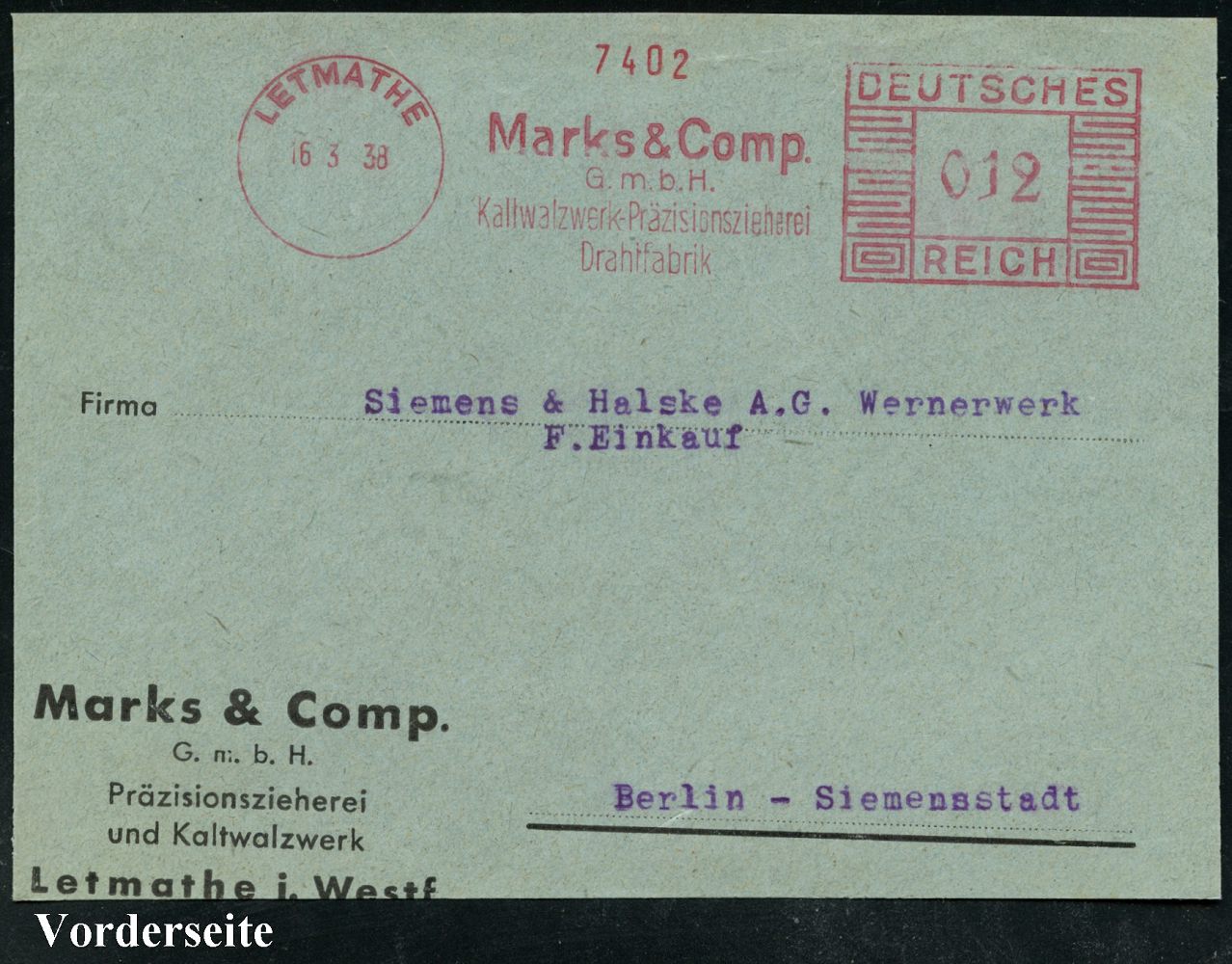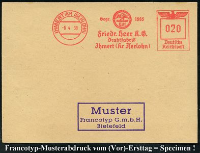 10821 | 35 € | PL-Raum 58 : IHMERT (KR ISERLOHN)/ Gegr. 1885/ Friedr.Heer K.G./ Drahtfabrik.. 1938 (6.4.) AFS-Musterabdruck Francotyp "Reichsadler" (Firmen-Logo mit Adler) glasklar gest. Francotyp-Musterabdruck vom (Vor)-Ersttag !, selten! (Dü.E-5CGo) | ![]() ![]() | |
