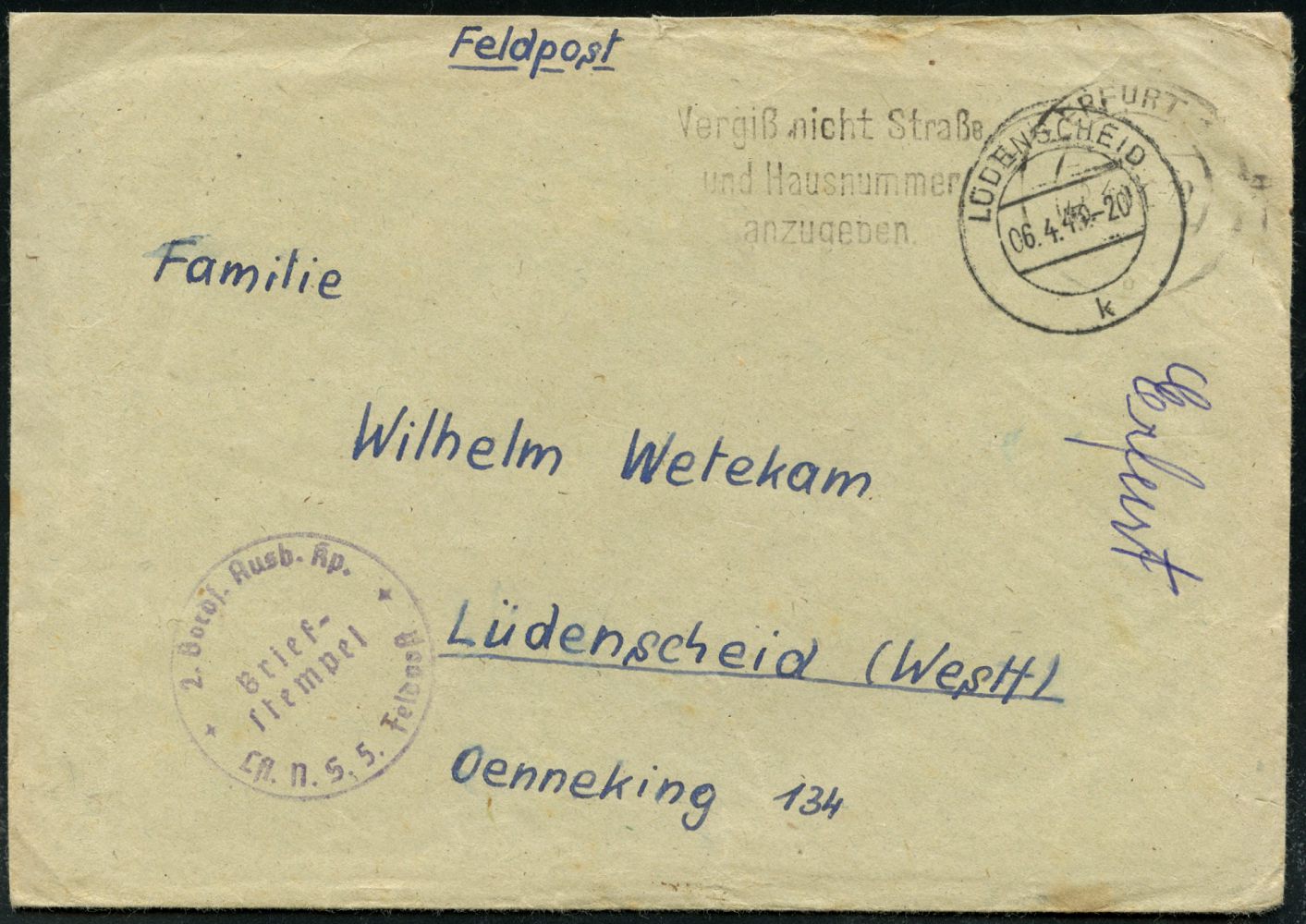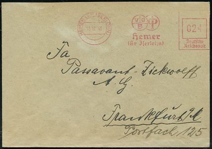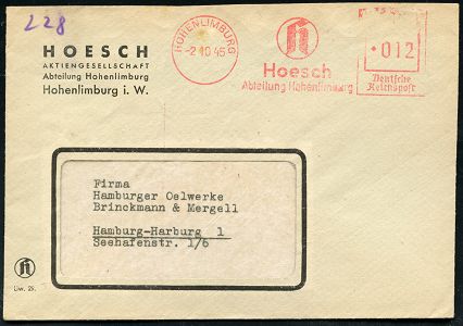 10817 | 28 € | PL-Raum 58 : HOHENLIMBURG/ Hoesch/ Abteilung Hohenlimburg 1945 (2.10.) aptierter AFS Francotyp "Reichsadler" = entfernt = Notmaßnahme! (Monogr.-Logo) rs. rotviol. Abs.-2L, Firmen-Fern-Bf. (Dü.E-13 L-147o = seltene Type!) | ![]() ![]() | |