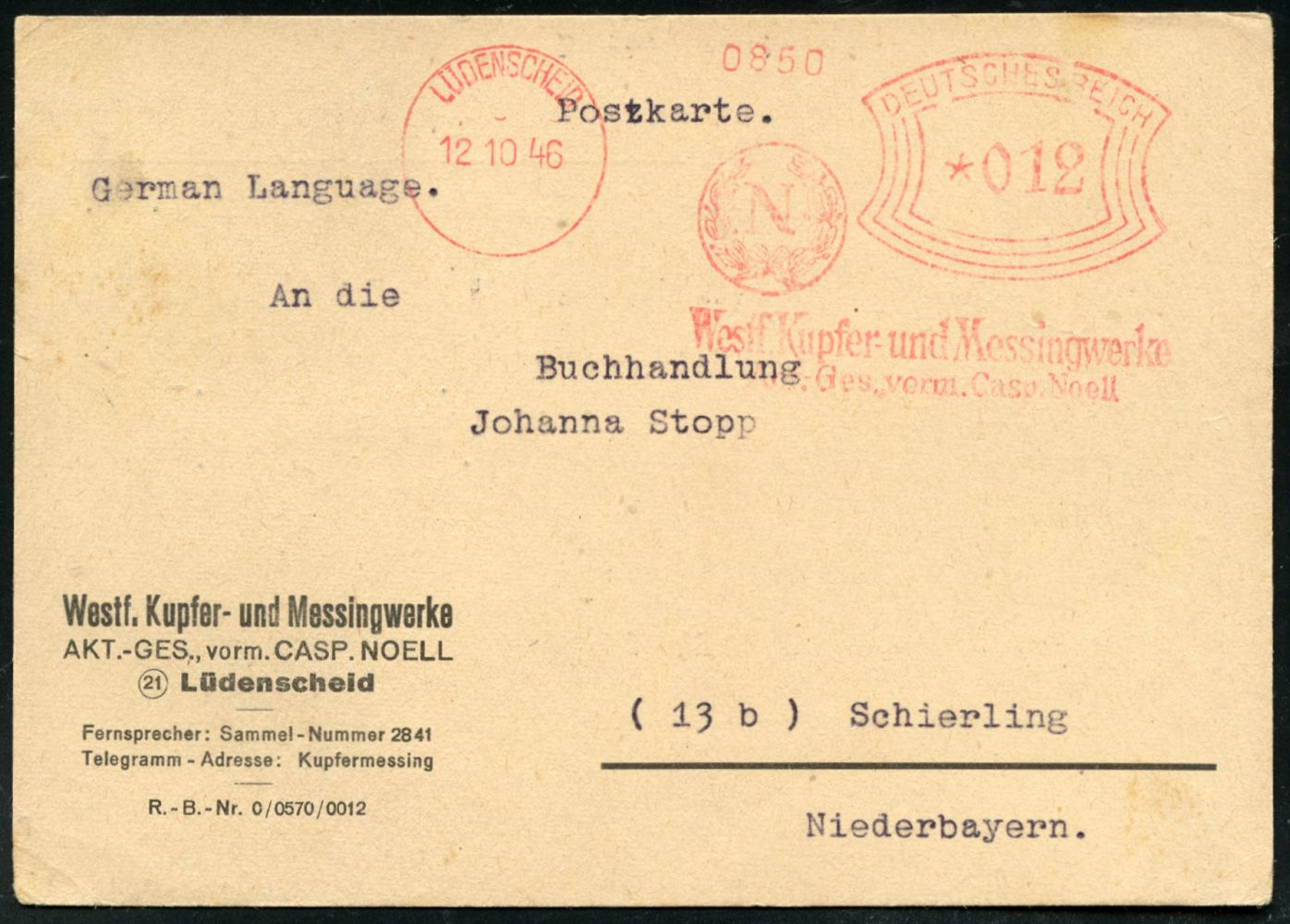 10882 | 25 € | PL-Raum 58 : LÜDENSCHEID/ Westf.Kupfer-u.Messingwerke/ Akt.-Ges. vorm.Casp.Noell 1946 (12.10.) AFS Francotyp "Bogenrechteck" u n v e r ä n d e r t weiterverwendet = Notmaßnahme! (Monogr.-Logo "N" im Lorbeerkranz) Inl.-Firmen-Kt. (Dü.E-1Ah, unverändert) | ![]() | |