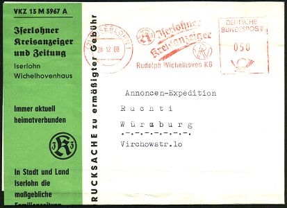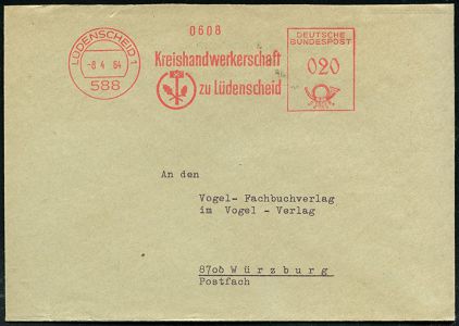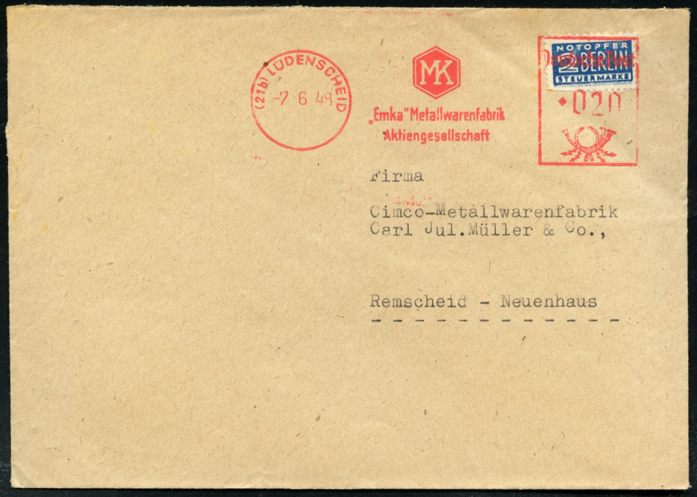 10885 | 15 € | PL-Raum 58 : (21b) LÜDENSCHEID/ MK/ "Emka" Metallwaren/ AG 1949 (7.6.) AFS Francotyp "Posthorn" auf gez. 2 Pf. NoB (= Vorausentwertung) rs. Abs.-Vordruck (kl. Klappenriß geschl.) Fern-Bf. (Dü.E-20DGo) | ![]() | |