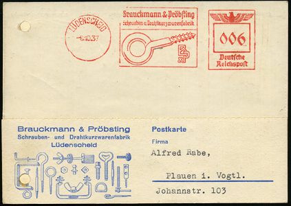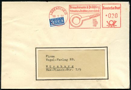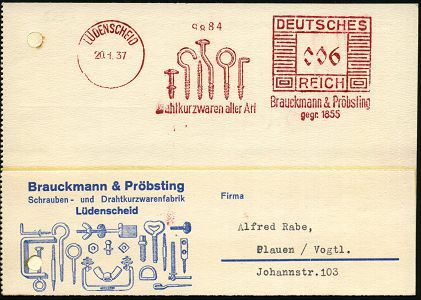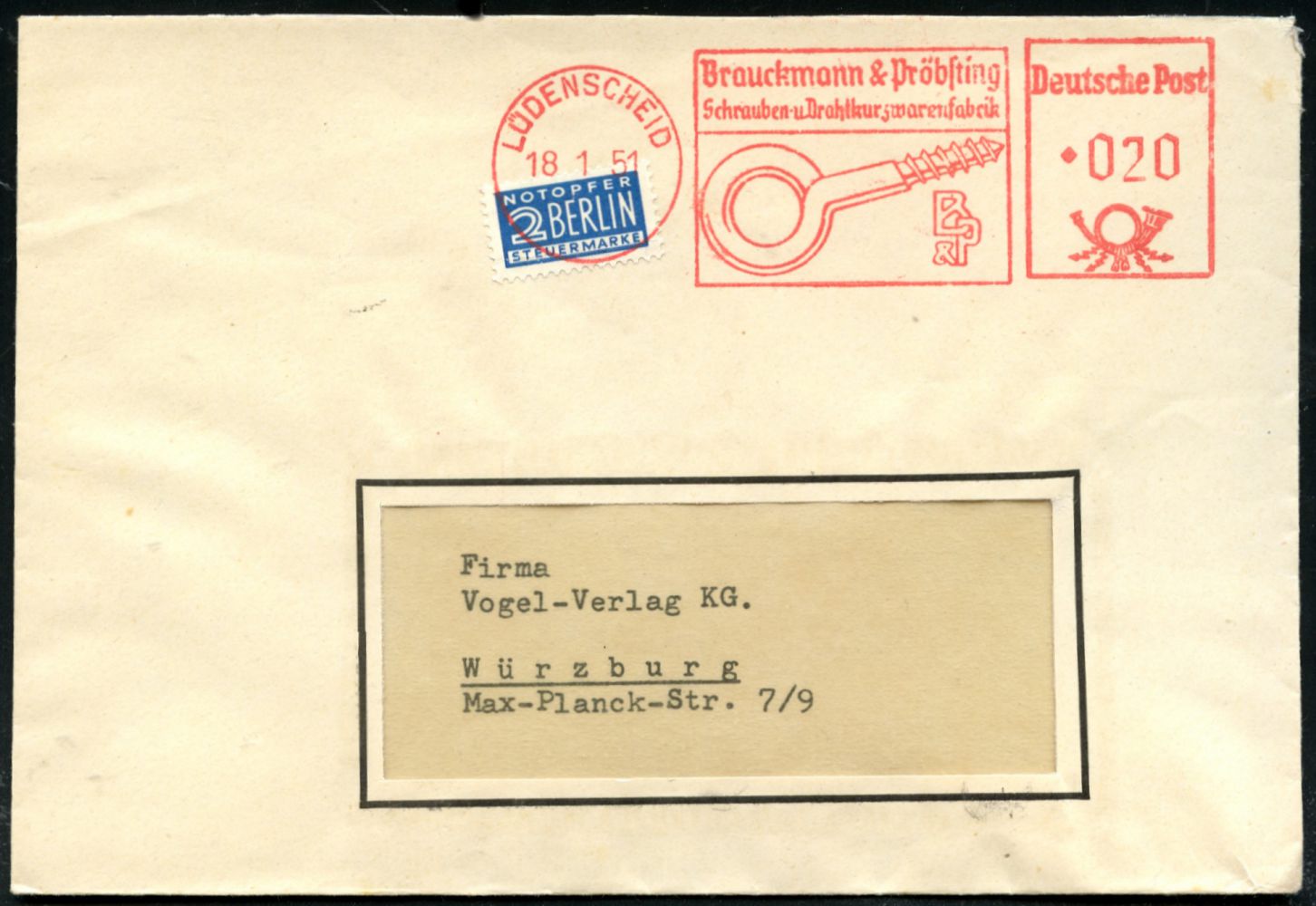 10888 | 15 € | PL-Raum 58 : LÜDENSCHEID/ Brauckmann & Pröbsting/ Schrauben-u.Drahtkurzwarenfabrik 1951 (18.1.) AFS Francotyp "Posthorn" (Ringschraube u. Monogr.-Logo) auf 2 Pf. NoB (= Vorausentwertung) rs. Abs.-Vordruck, links etw. verkürzter Firmen-Fern-Bf. (Dü.E-20DGo) | ![]() | |