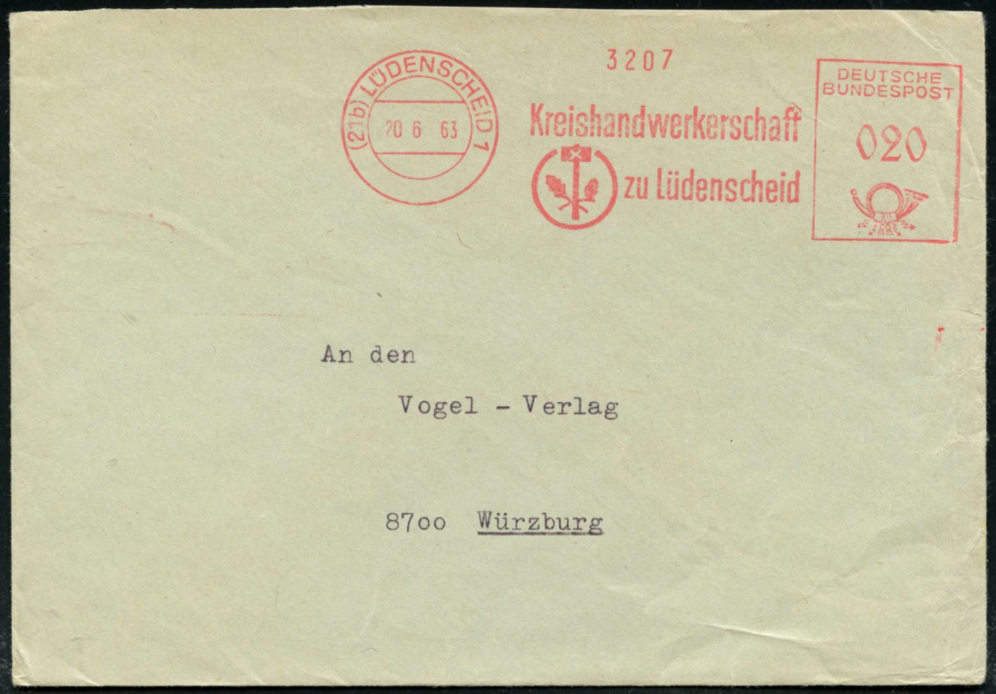 10890 | 20 € | PL-Raum 58 : (21b) #bzw.#588 LÜDENSCHEID 1/ Kreishandwerkerschaft.. 1963/64 2 verschiedene AFS Francotyp (je Hammer-Logo) mit sehr später a l t e r PLZ u. neuer PLZ und a l t e r Zähllnummer! (neue PLZ ab 1961 !) , je rs. Abs.-Vordruck, je auf Fern-Bf., 2 Belege (Dü.E-23CEh, alte u. neue PLZ) | ![]() ![]() ![]() | |
