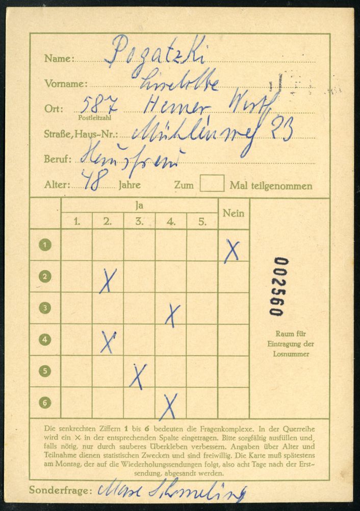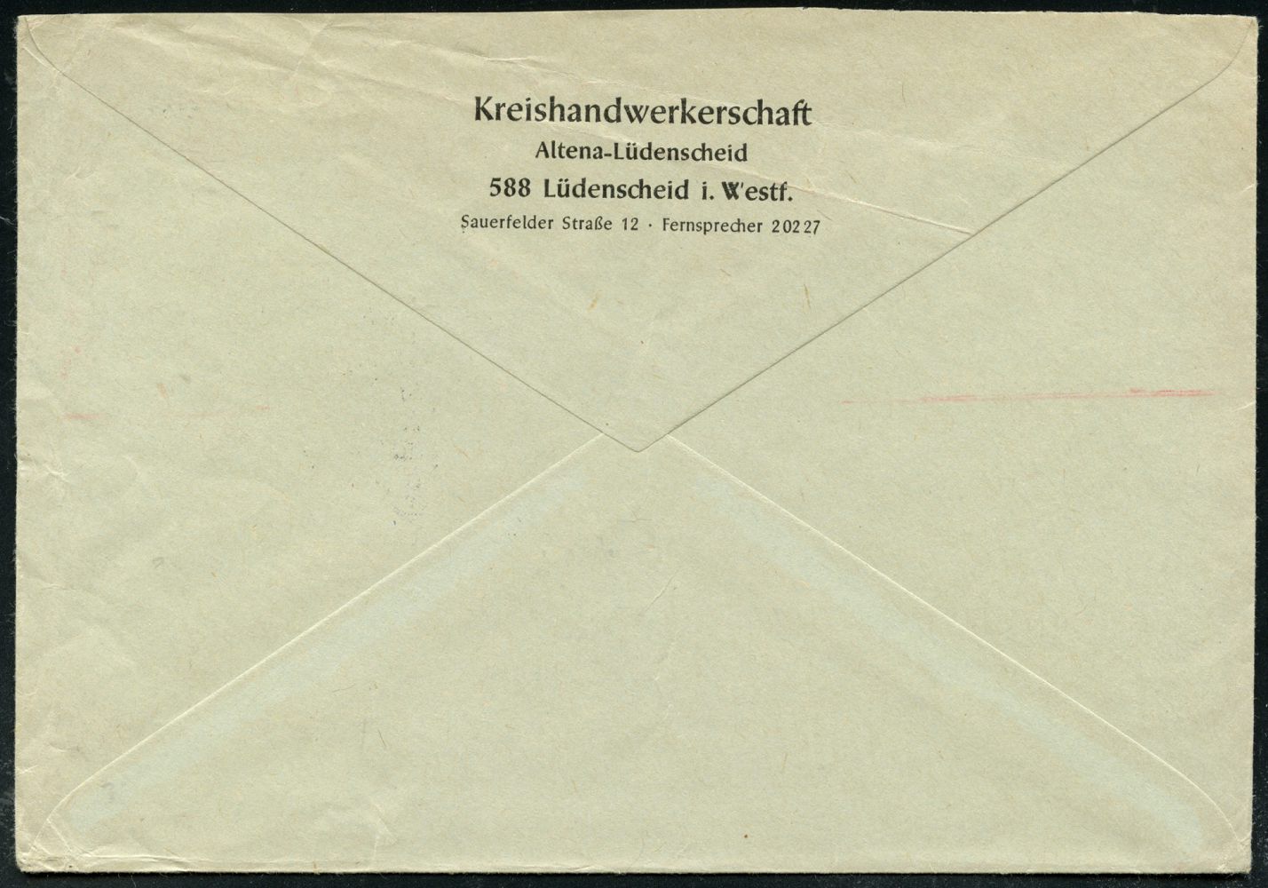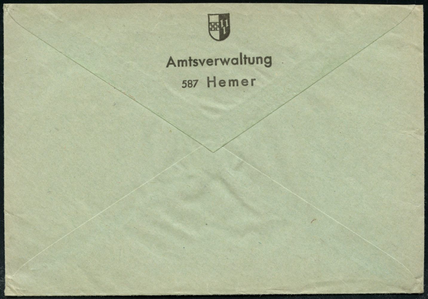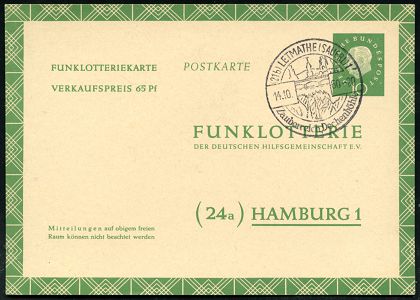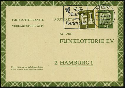 10791 | 18 € | PL-Raum 58 : 587 HEMER/ sa/ Jede/ Anschrift/ mit/ Postleitzahl 1964 (10.4.) MWSt auf Funklotterie-FP 10 Pf. Dürer (Mi.FP 9 + 17,50 EUR) + 5 Pf. Zusatzfrankat., Bedarf!, seltene Verwendung! (Bo.S 1134 A) | ![]() ![]() | |