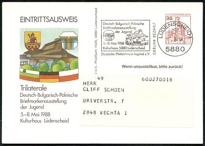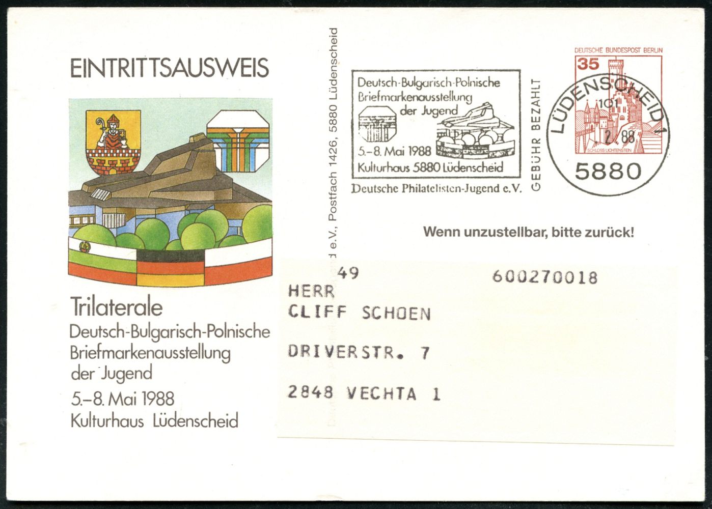 10897 | 8 € | PL-Raum 58 : 5880 LÜDENSCHEID 1/ 101/ GEBÜHR BEZAHLT/ Deutsch-Bulgarisch-Polnische/ Briefmarkenausstellung.. 1988 (Febr.) Absenderstempel (= Vorausentwertung) auf passender PP 35 Pf. Burgen, braun: EINTRITTSAUSWEIS Trilaterale.. (Kongreßzentrum, Wappen) Inl.-Karte | ![]() | |