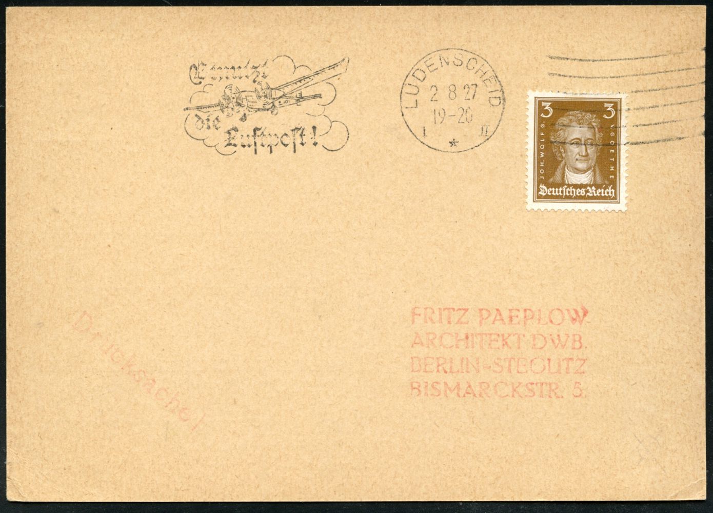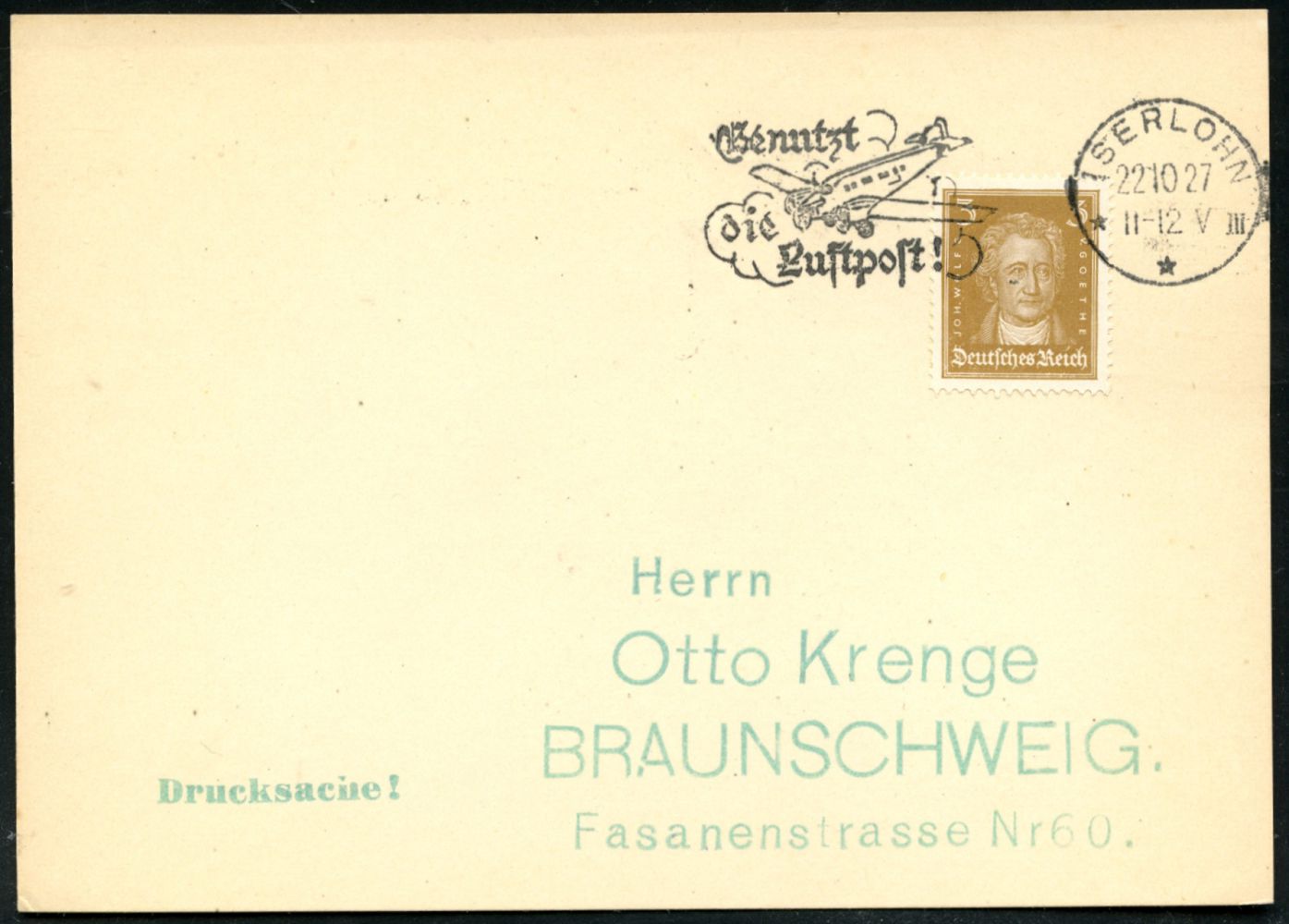 10823 | 15 € | PL-Raum 58 : ISERLOHN/ **III/ Benutzt/ die/ Luftpost! 1927 (22.10.) MWSt (Flugzeug Junkers G-31) klar auf Inl.-Drs.-Karte (Bo.S 71 A = Erstjahr) | ![]() | |